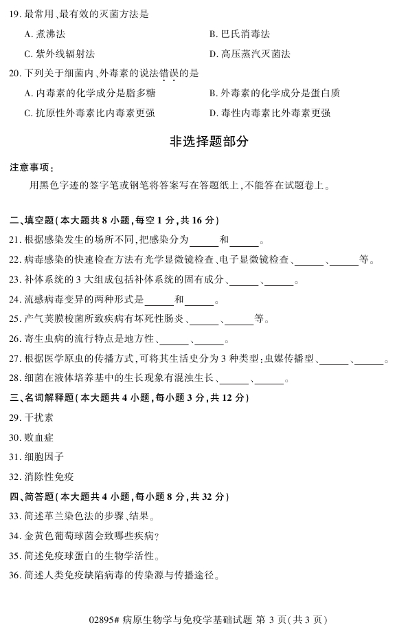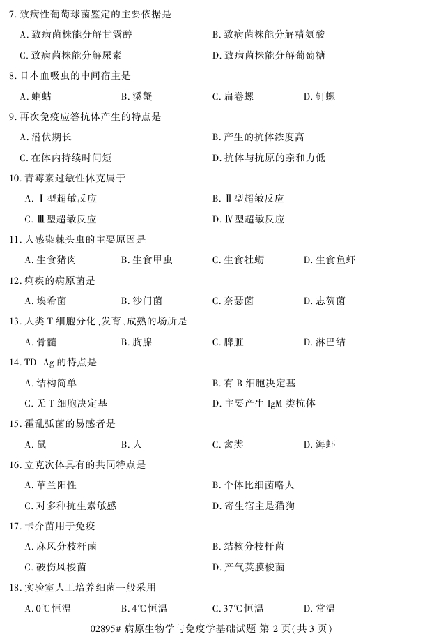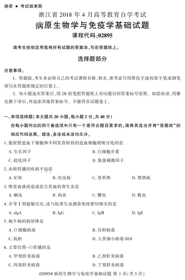 浙江省2018年4月高等教育自考02895病原生物学与免疫学基础试题PDF