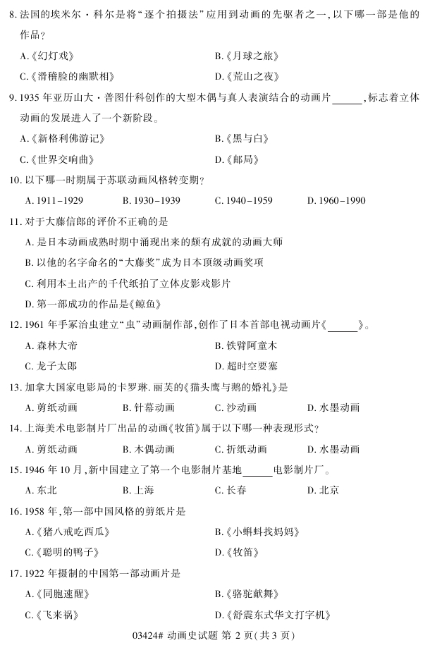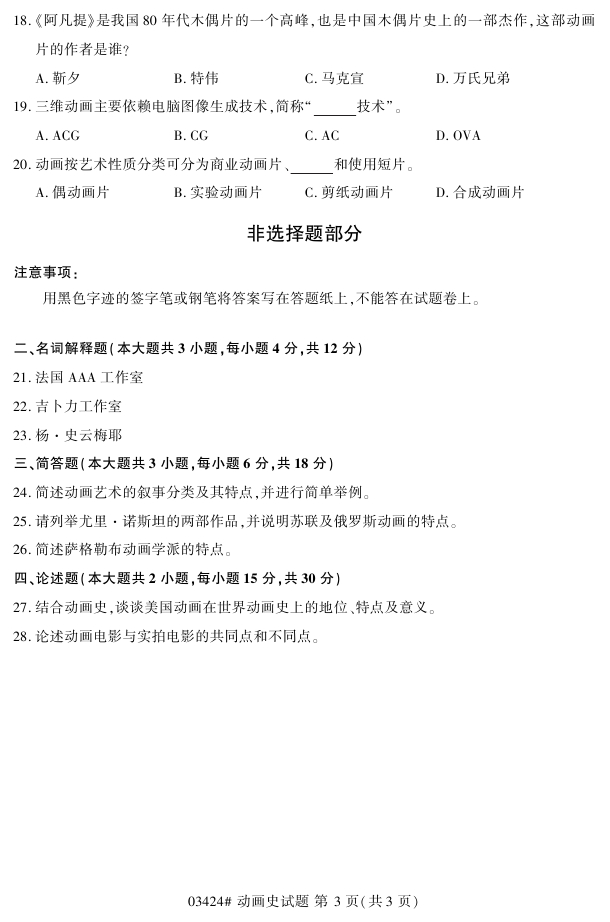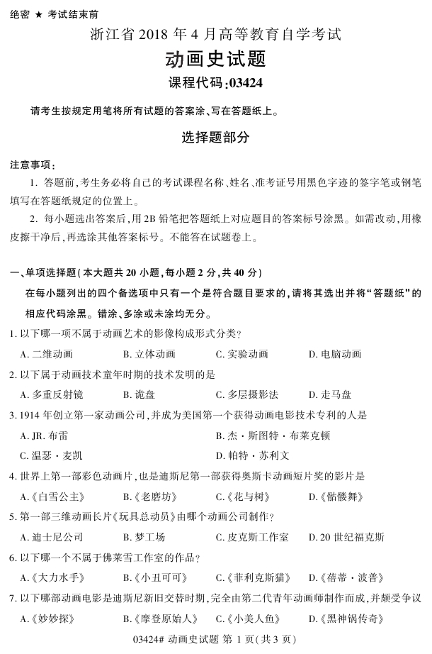 浙江省2018年4月高等教育自考03424动画史试题PDF