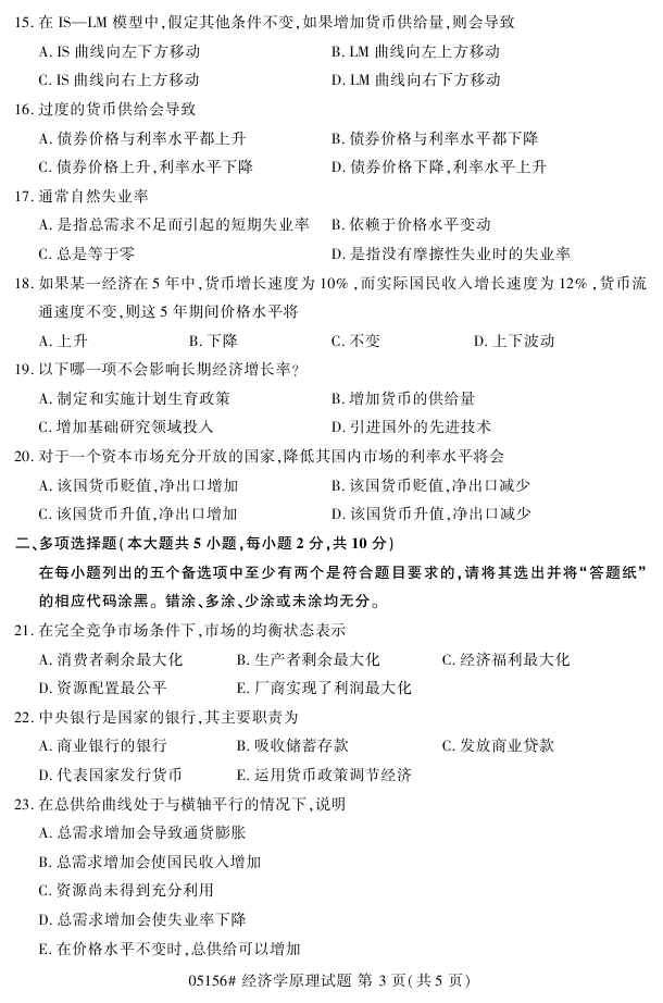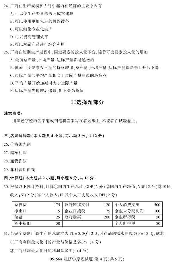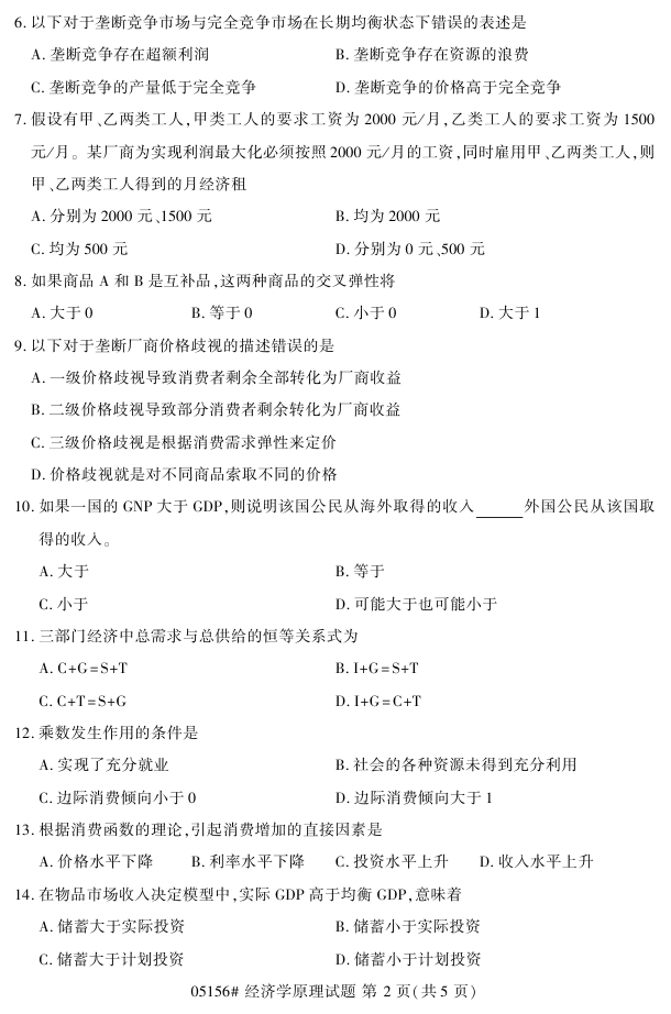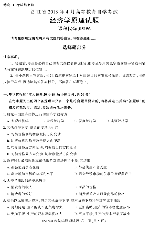 浙江省2018年4月高等教育自考05156经济学原理试题PDF