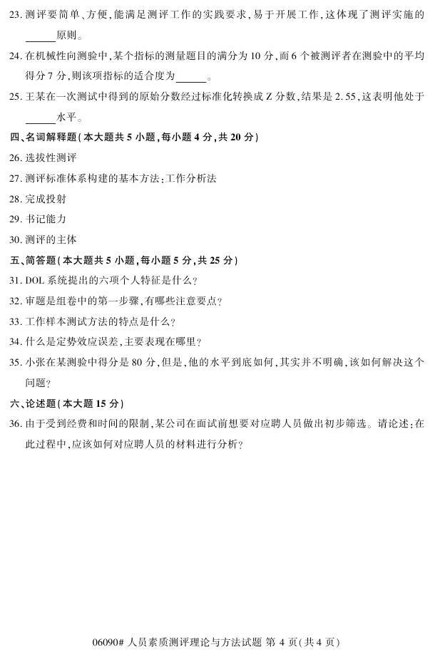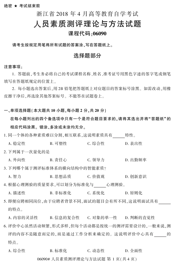 浙江省2018年4月高等教育自考06090人员素质测评理论与方法试题PDF