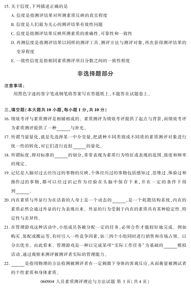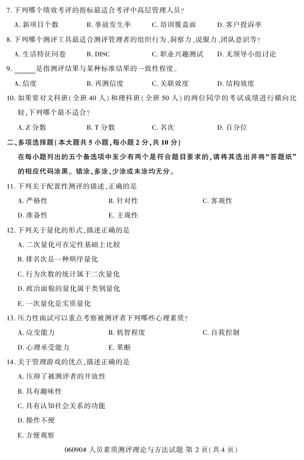 试题科目:人员素质测评理论与方法试题
