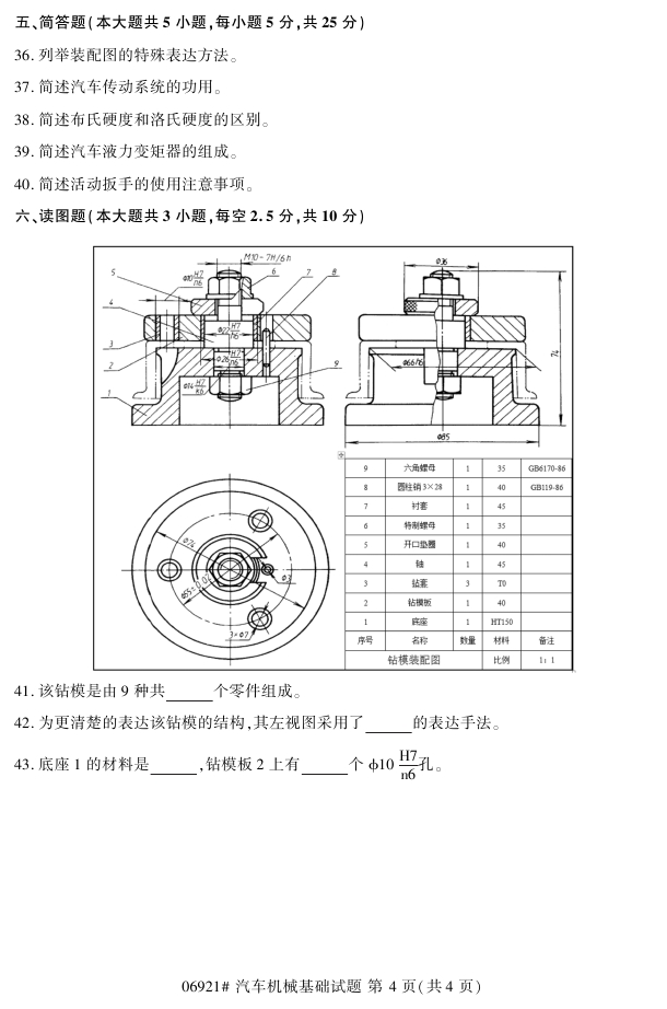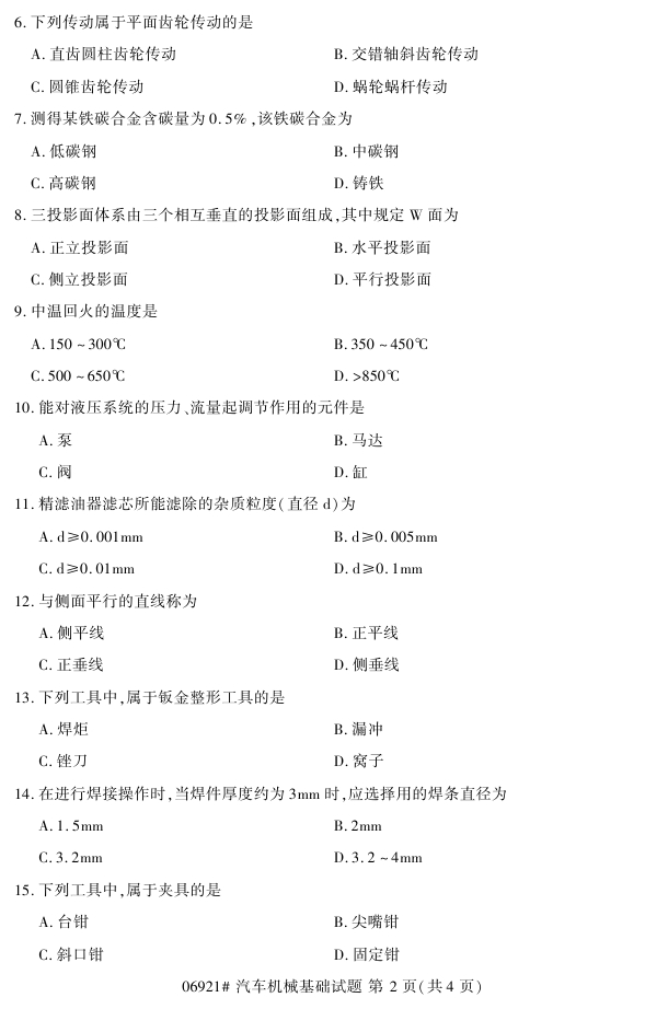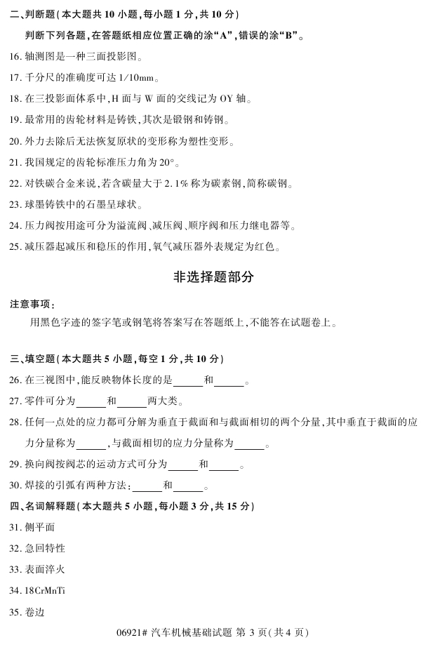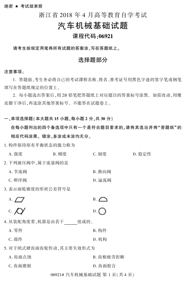 浙江省2018年4月高等教育自考06921汽车机械基础试题PDF