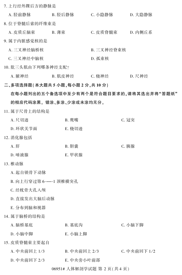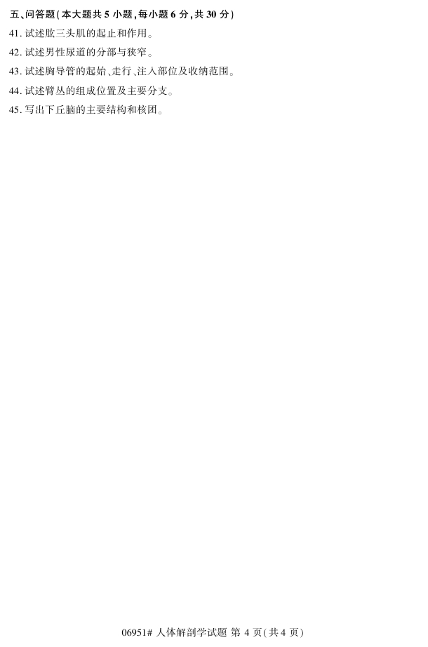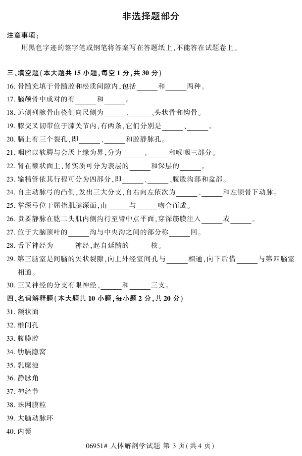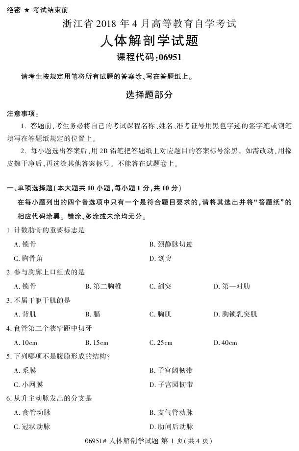 浙江省2018年4月高等教育自考06951人体解剖学试题PDF