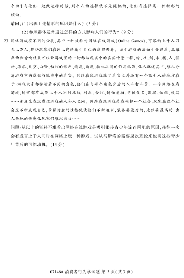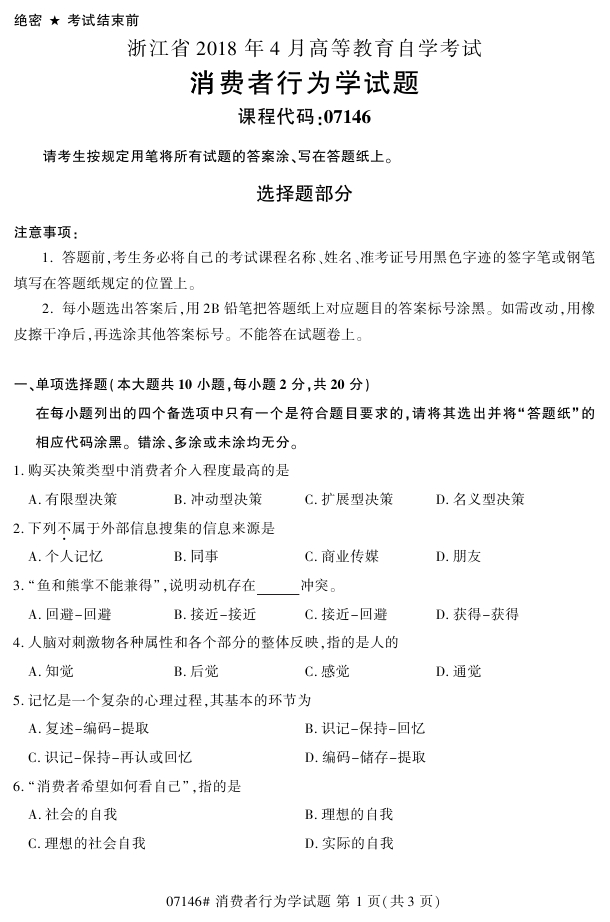 浙江省2018年4月高等教育自考07146消费者行为试题PDF