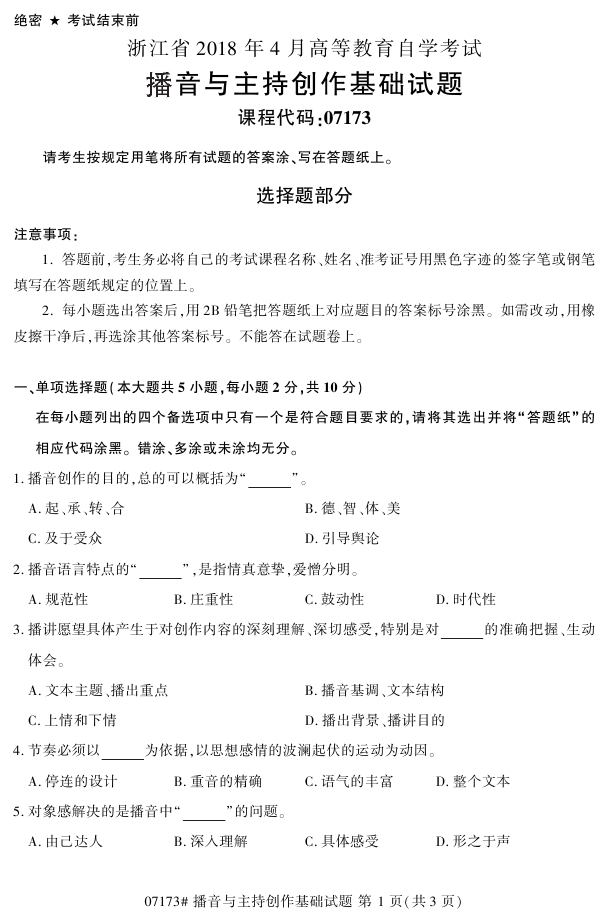浙江省2018年4月高等教育自考07173播音与主持创作基础试题PDF