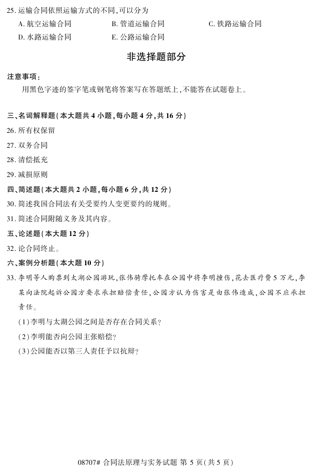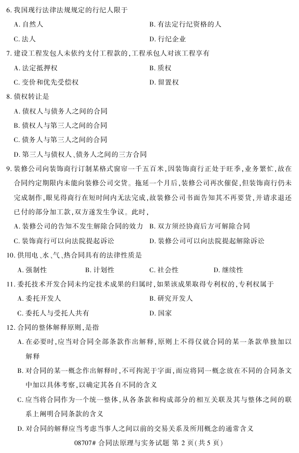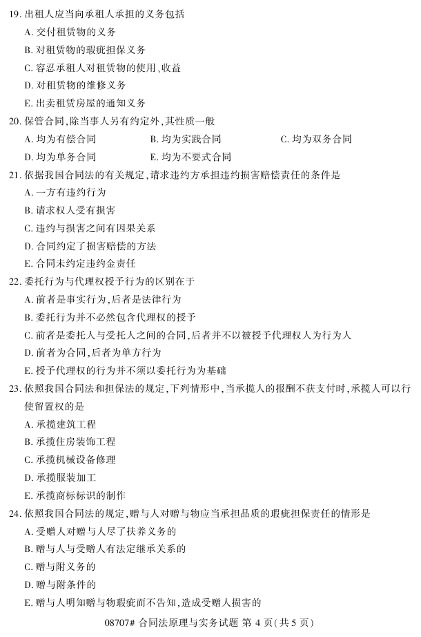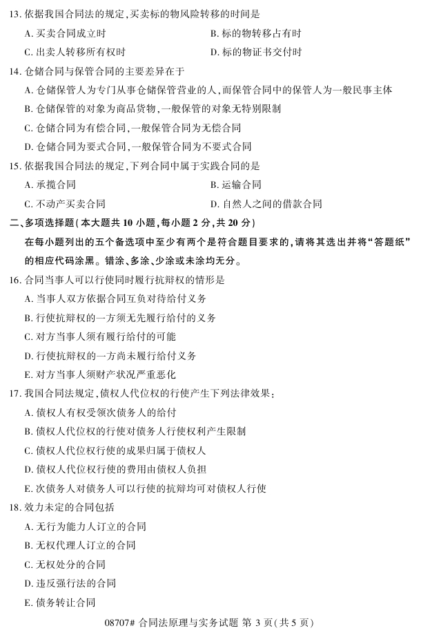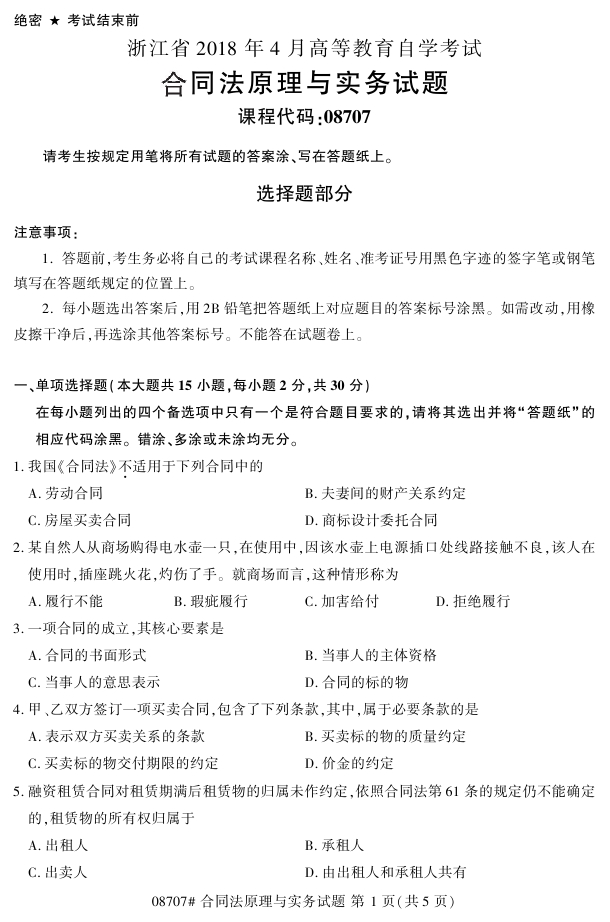 浙江省2018年4月高等教育自考08707合同法原理与实务试题PDF