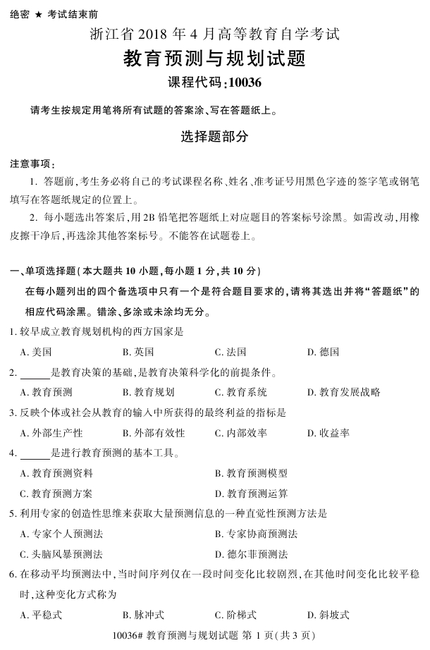 浙江省2018年4月高等教育自考10036教育预测与规划试题PDF