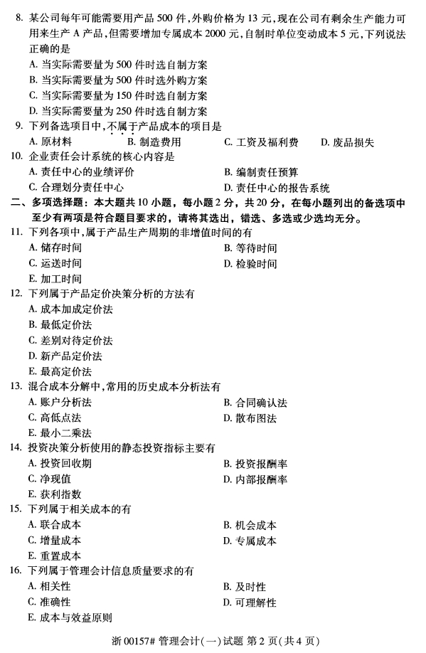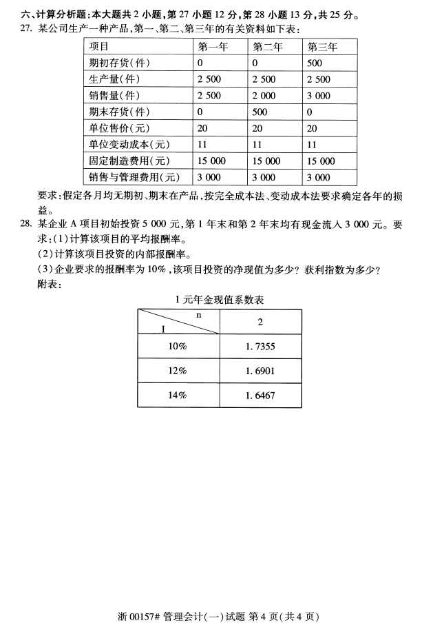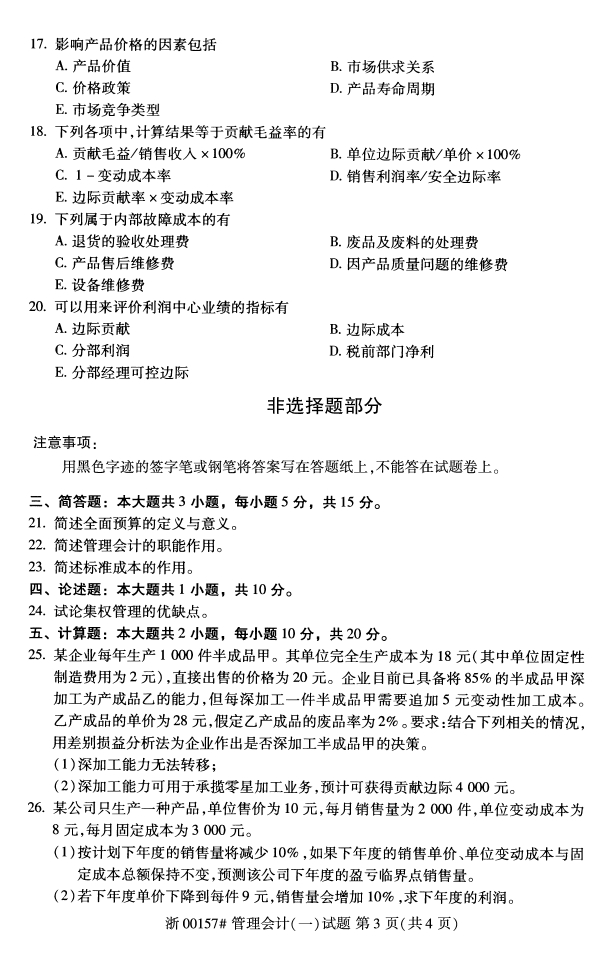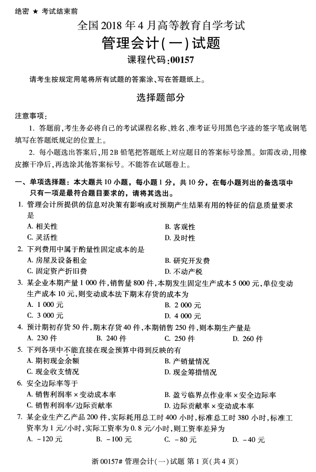 全国2018年4月高等教育自考00157管理会计(一)试题PDF