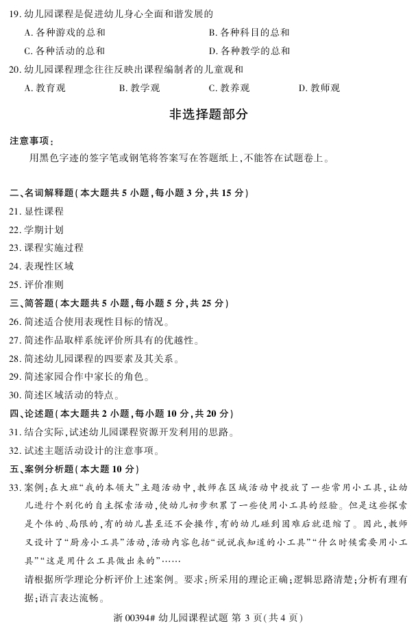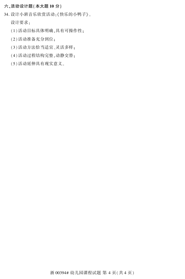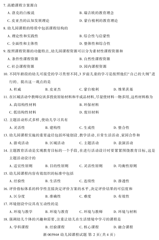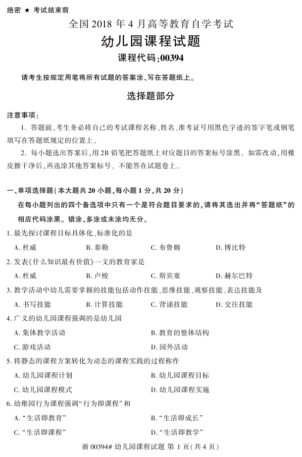 全国2018年4月高等教育自考00394幼儿园课程试题PDF