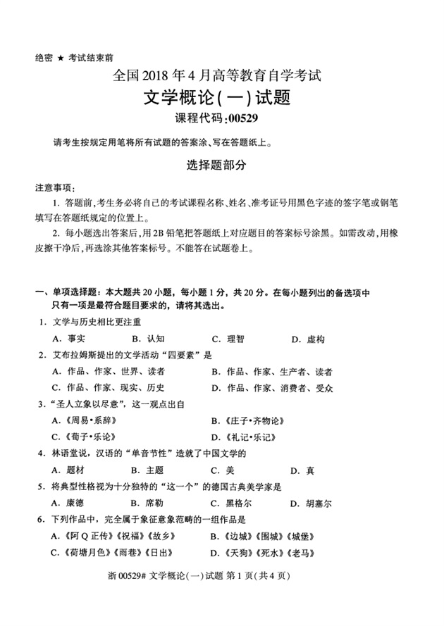 全国2018年4月高等教育自考00529文学概论(一)试题PDF