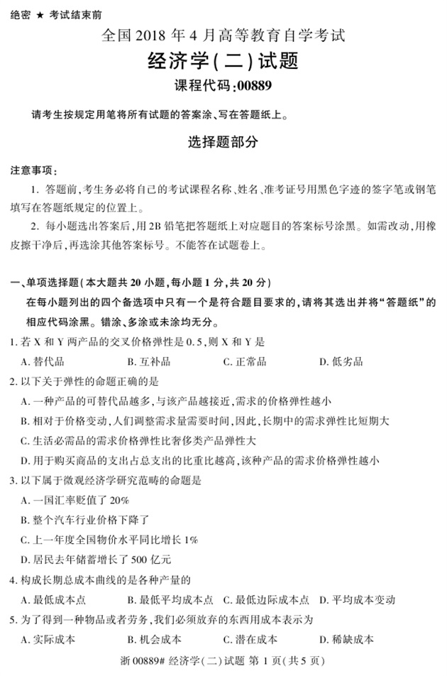 全国2018年4月高等教育自考00889经济学(二)试题PDF