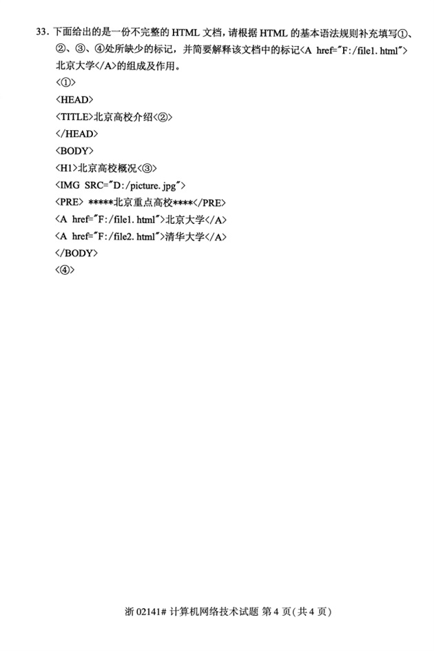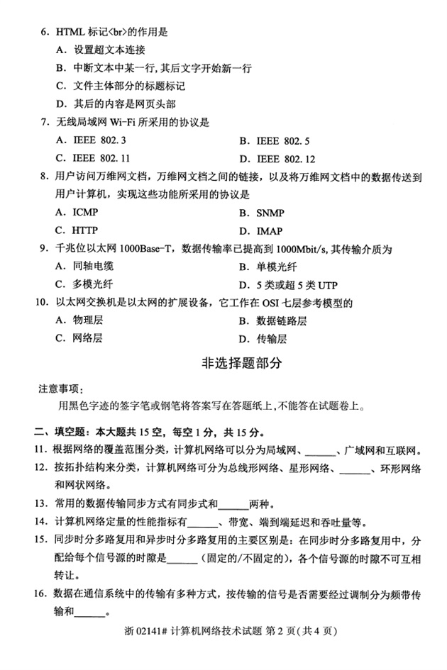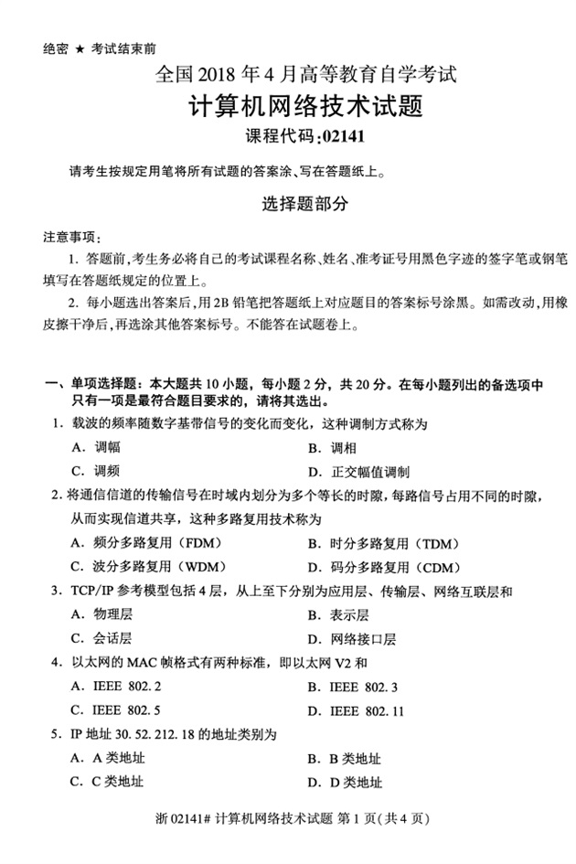 全国2018年4月高等教育自考02141计算机网络技术试题PDF