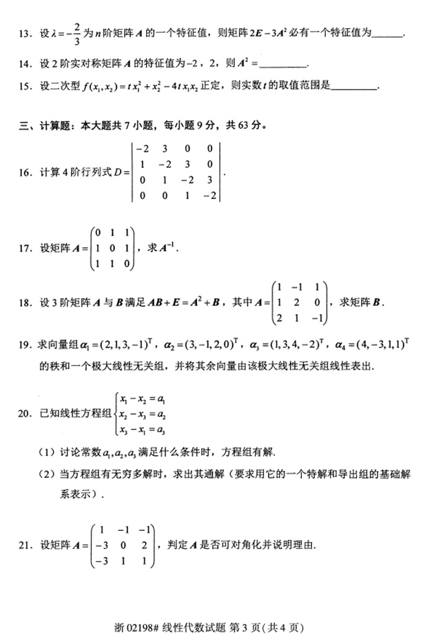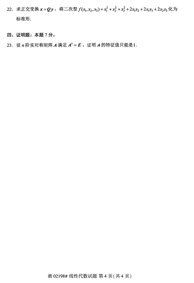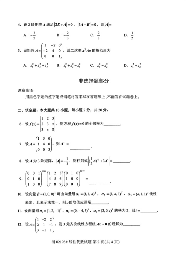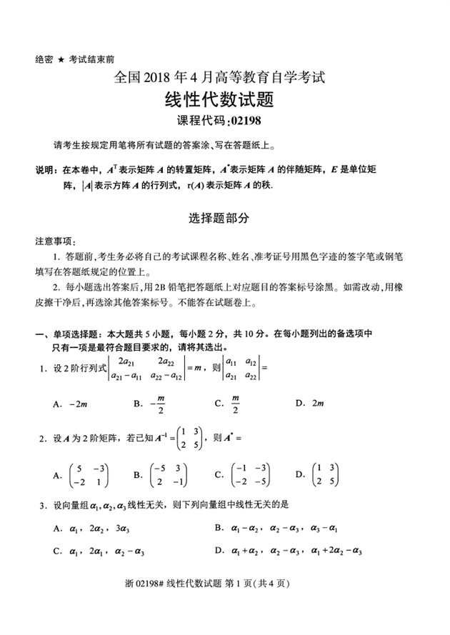 全国2018年4月高等教育自考02198线性代数试题PDF