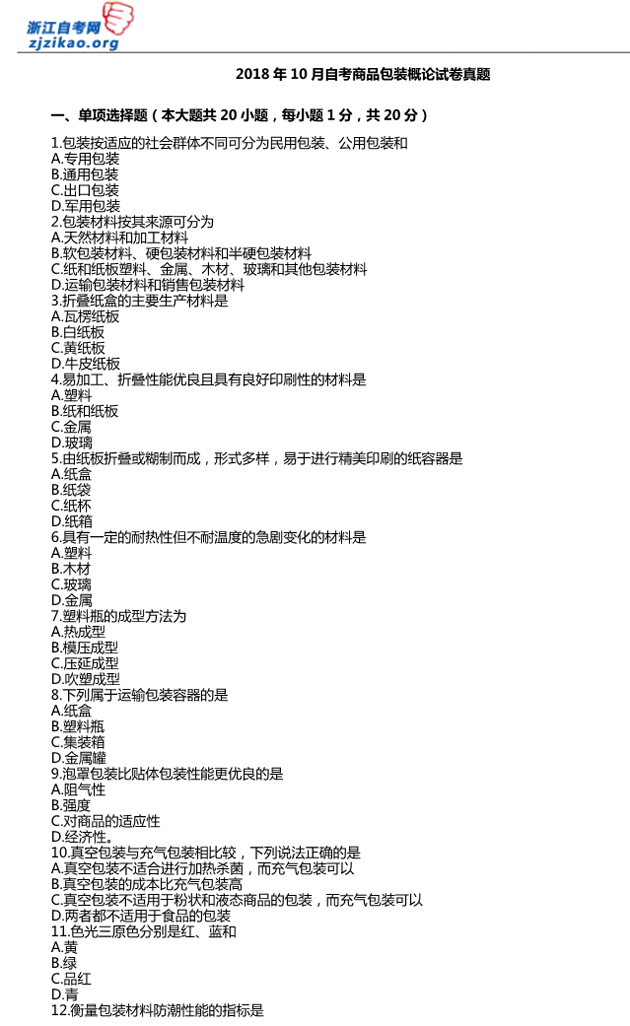 全国2018年10月高等教育自考《商品包装概论》试题,由浙江自考网整理,供全国自考生参考。更多自考真题练习,敬请自考生关注浙江自考网。