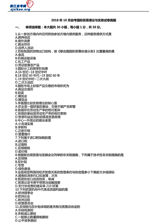 全国2018年10月高等教育自考《国际贸易理论与实务》试题,由浙江自考网整理,供全国自考生参考。