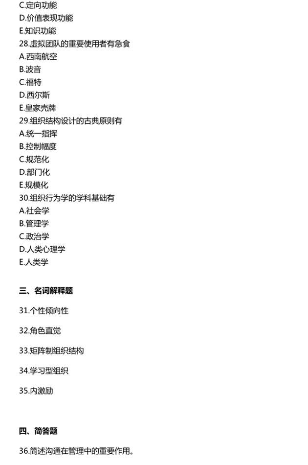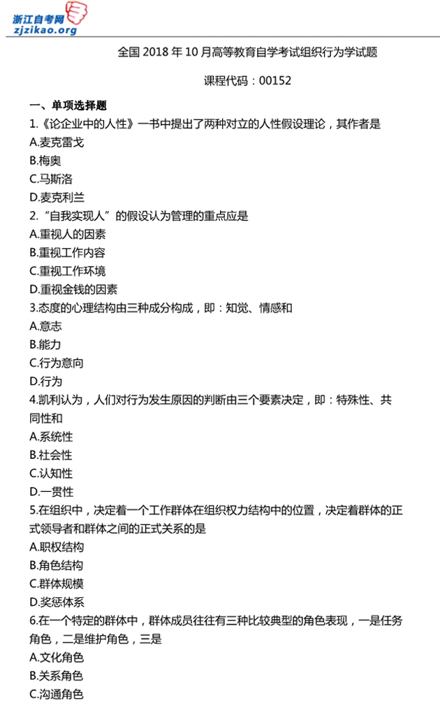 全国2018年10月高等教育自考《组织行为学》试题,由浙江自考网整理,供全国自考生参考。
