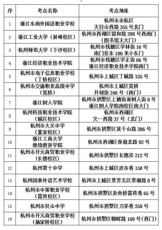 备注:杭州市区直辖考点指上城区、拱墅区、西湖区、滨江区、钱塘区内的考点,不包括萧山区、临平区、余杭区、临安区等四区,请这四区的考生注意,四区的考点地址未列在此公告中,请按照自己准考证上的考点地址,及时赴考。