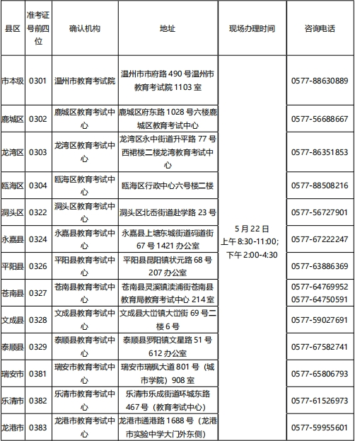 四、本次课程免考申请登记的时间为5月11日00:00-20日24:00,请考生按准考证号前4位选择对应地区招考机构提交申请材料,其中“市本级”为过渡期受理点,仅受理在温州地区只有“0301”单个准考证的考生,如在温州地区有多个准考证,请至对应县(市、区)提交材料。各地区现场提交材料的时间见下表。考生需按时进行课程免考申请登记和提交材料,逾期不受理。