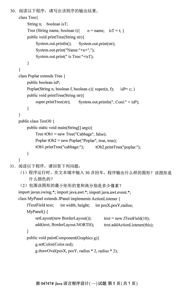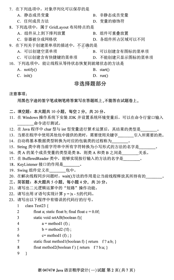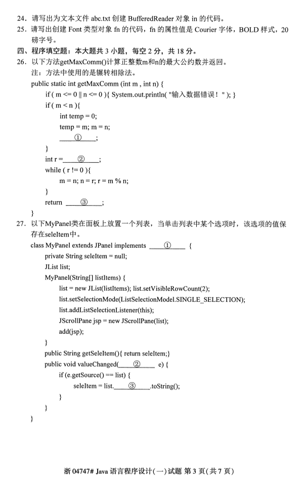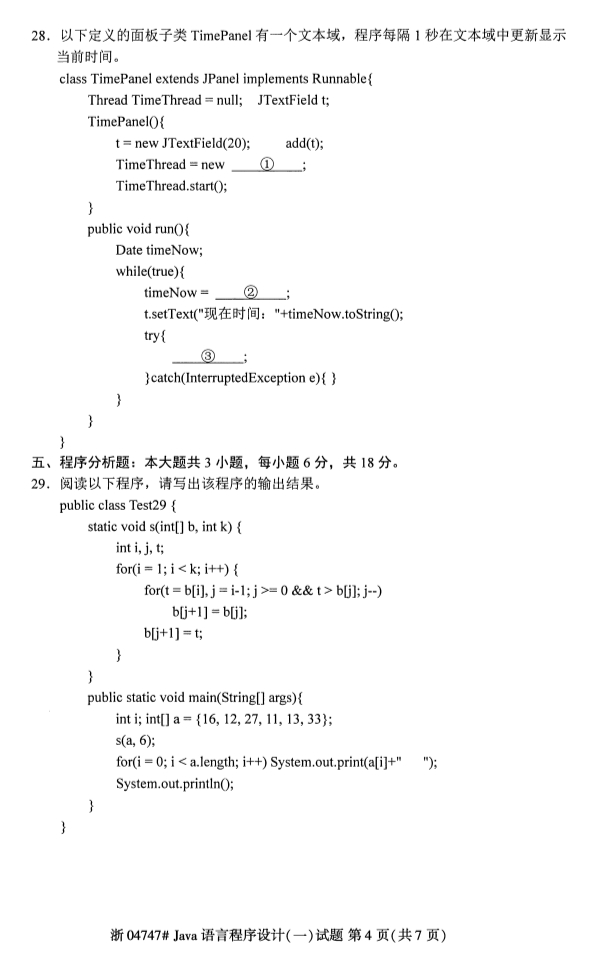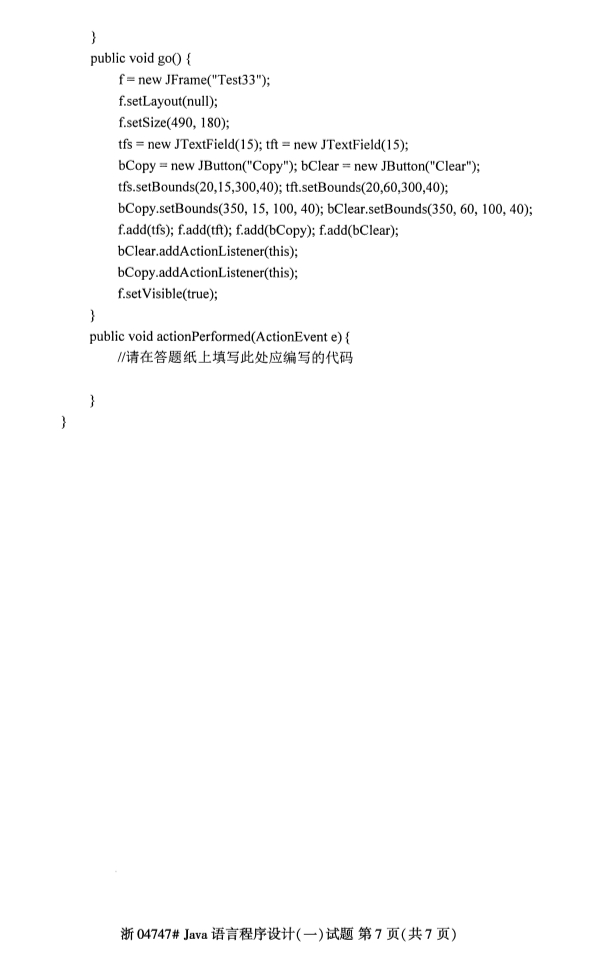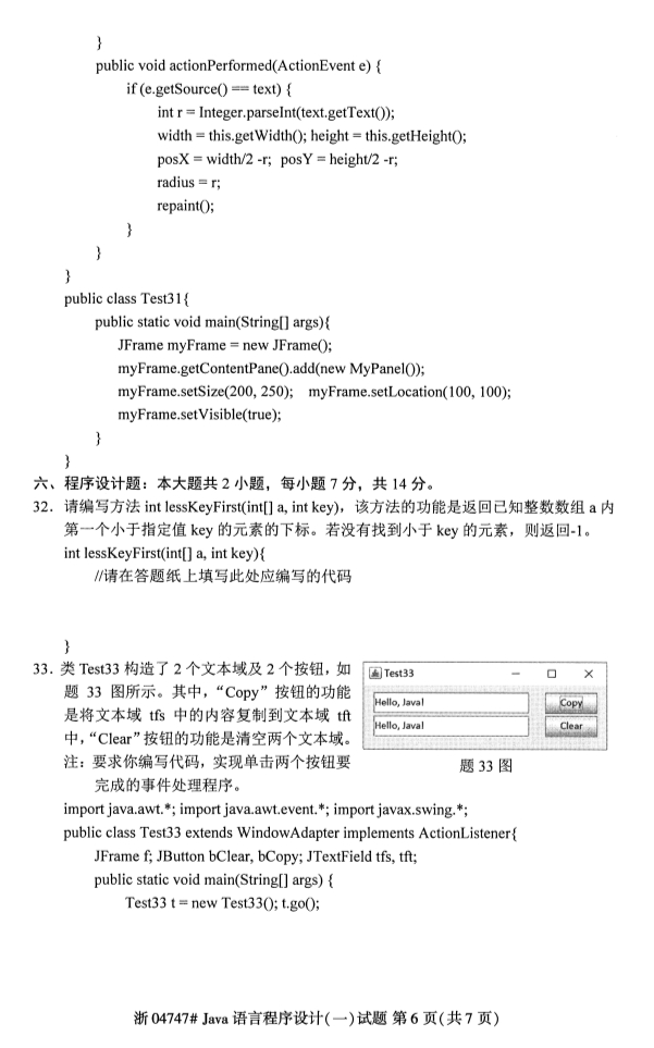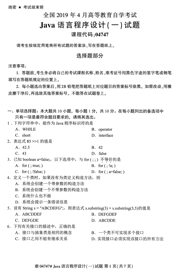 全国2019年4月自考04747JAVA语言程序设计(一)试题
