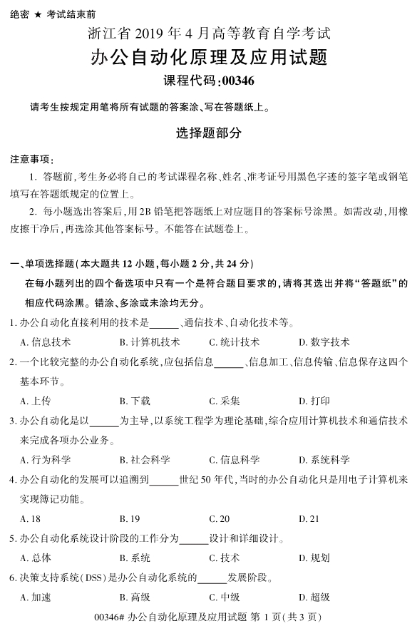 • 所在位置:浙江自考网 > 自考试卷 > 浙江2019年4月自考办公自动化原理及应用试题