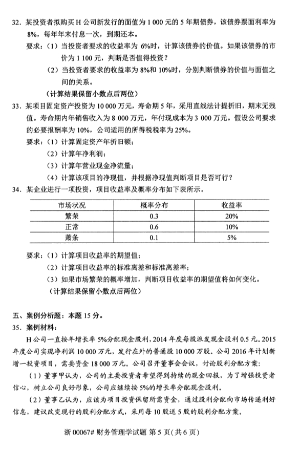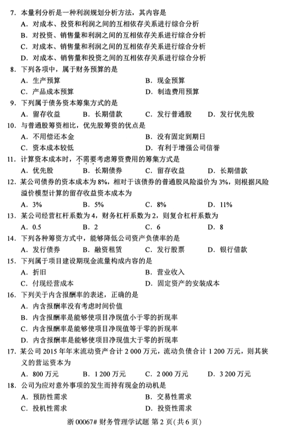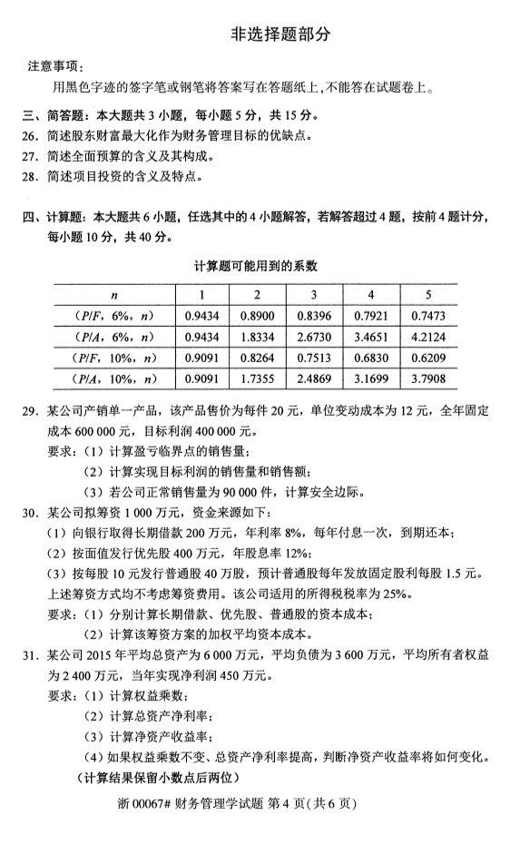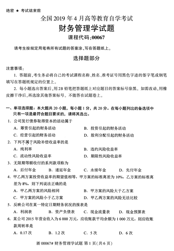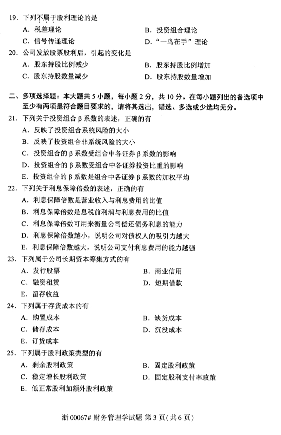 - 2024年10月浙江自考00067财务管理学试题 12-20