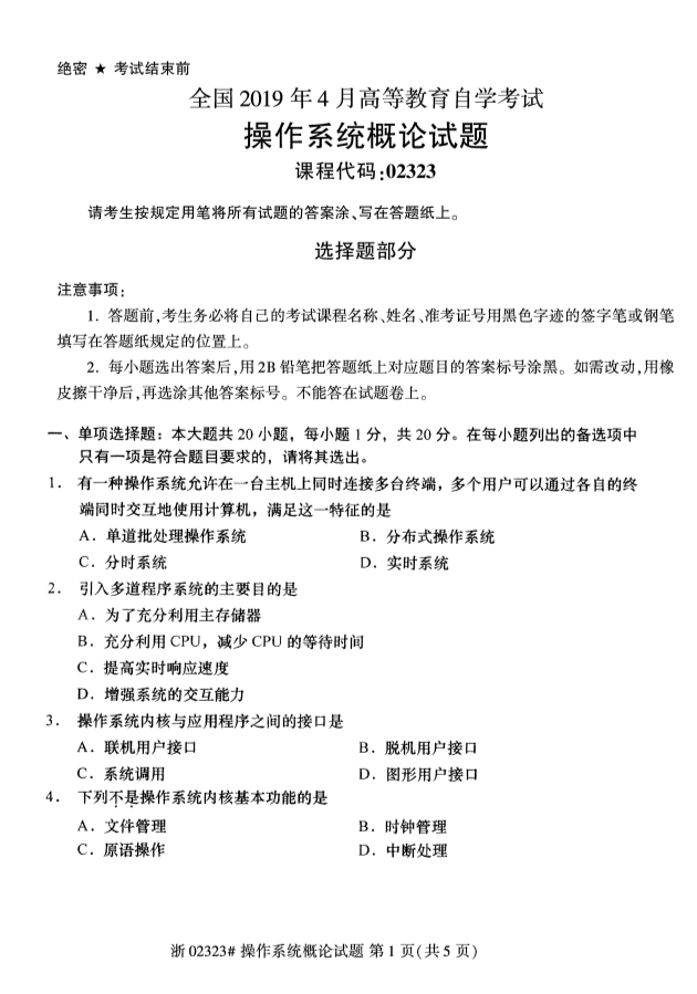 真题下载:全国2019年4月自考02323操作系统概论试题
