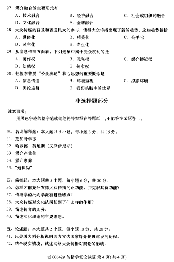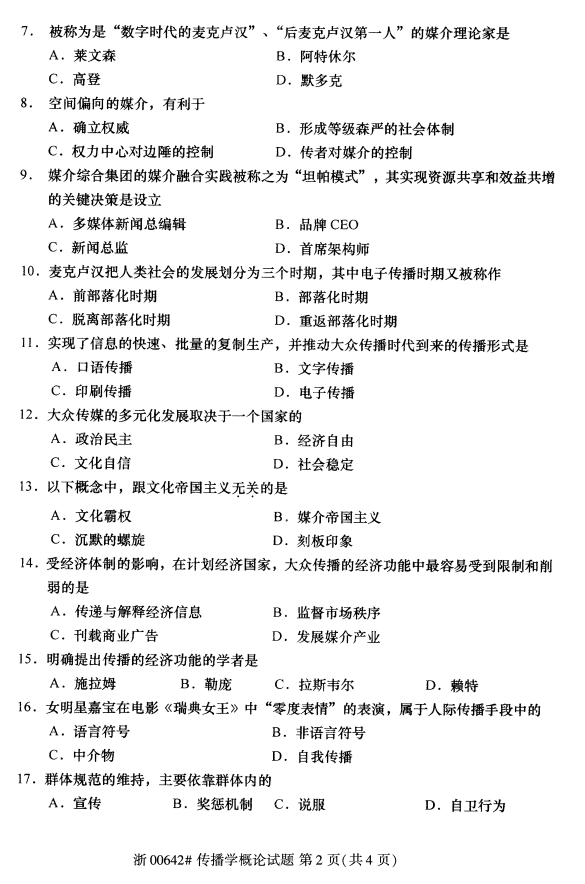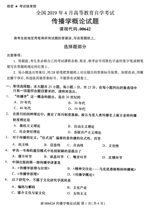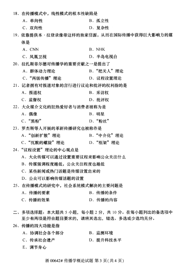 • 所在位置:浙江自考网 > 自考试卷 > 全国2019年4月自考00642传播学概论试题