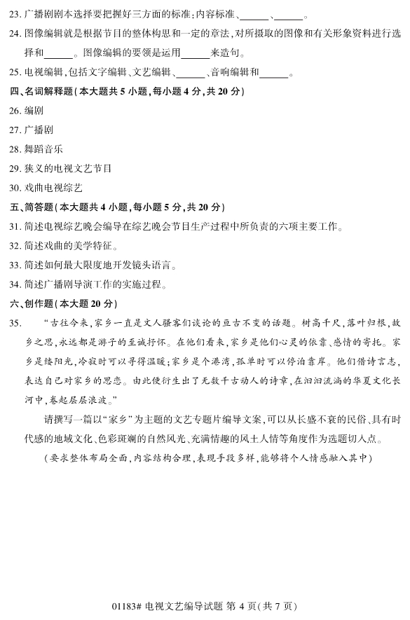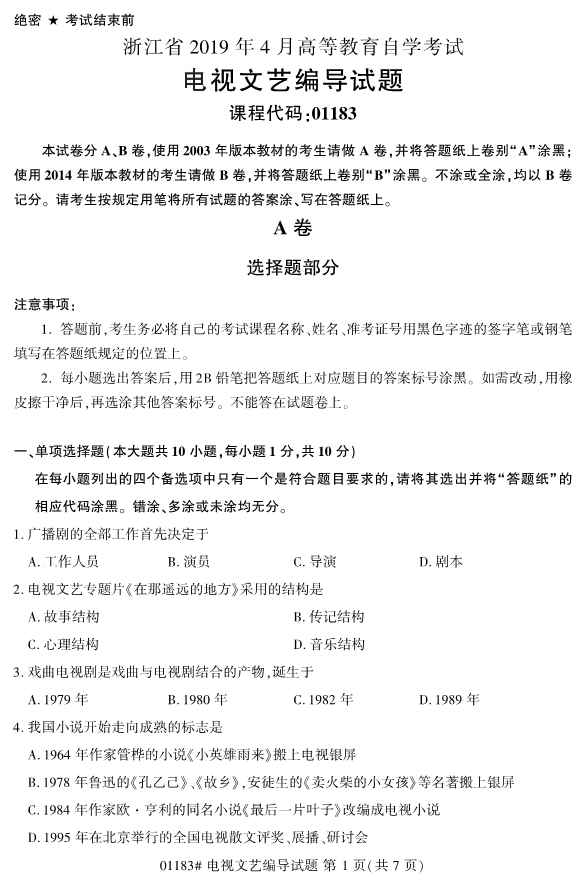 真题下载:浙江省2019年4月自考01183电视文艺编导试题