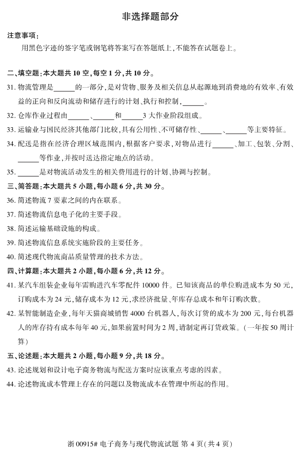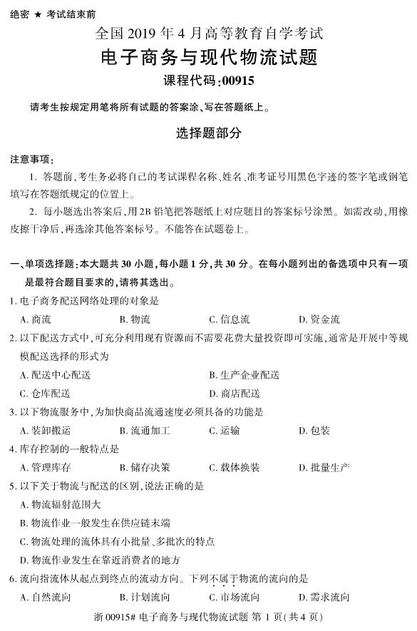 真题下载:全国2019年4月自考00915电子商务与现代物流真题