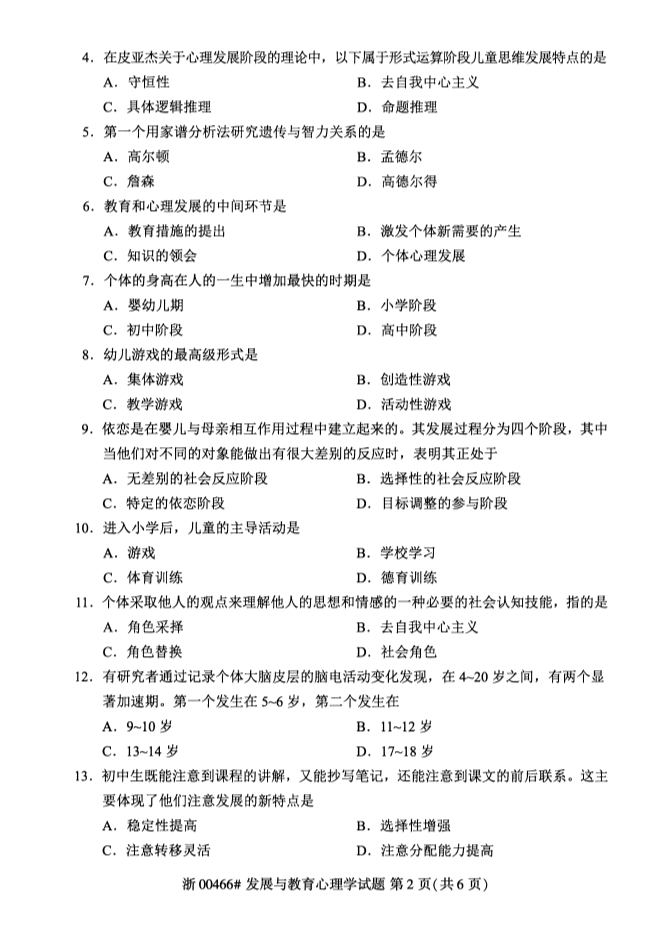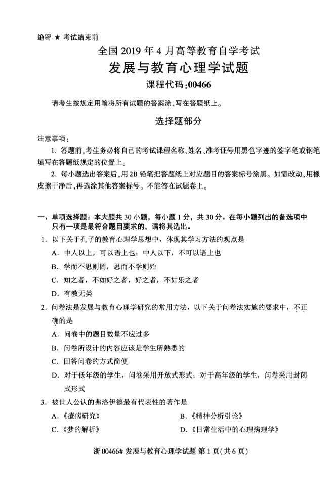 真题下载:全国2019年4月自考00466发展与教育心理学真题