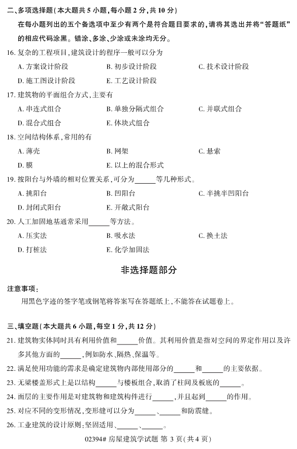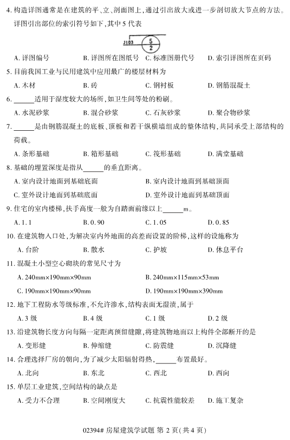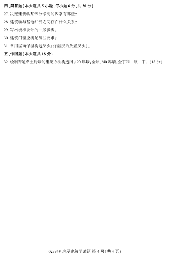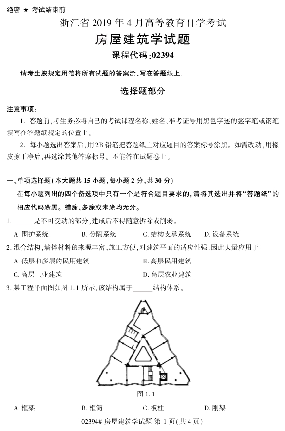 真题下载:浙江省2019年4月自考02394房屋建筑学真题