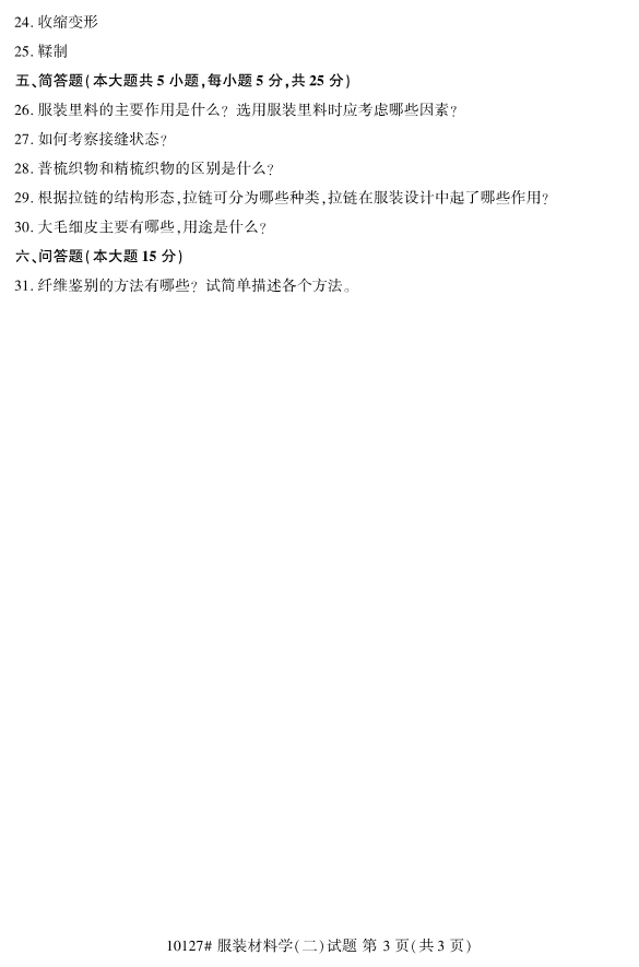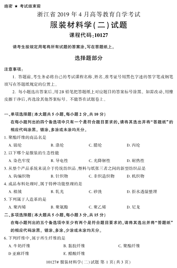 真题下载:浙江省2019年4月自考10127服装材料学(二)真题