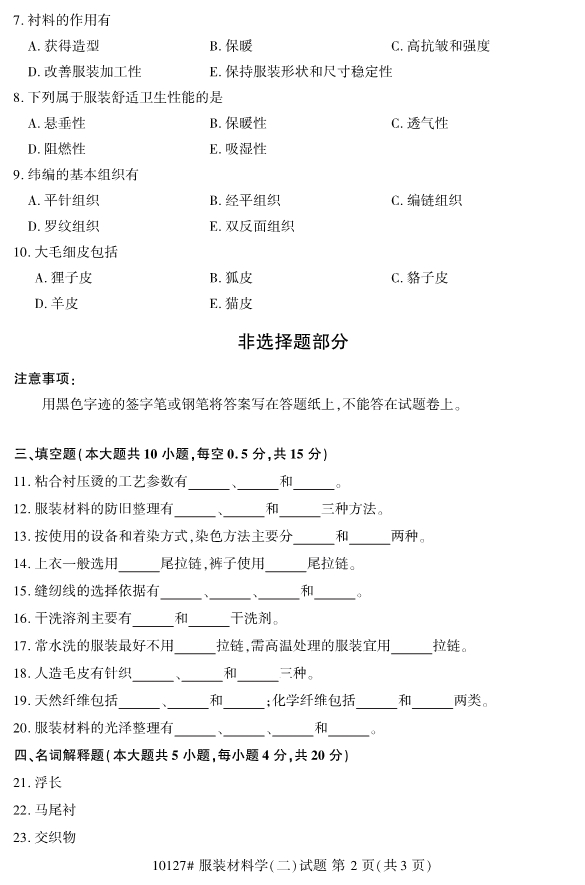 浙江省2019年4月自考10127服装材料学(二)真题