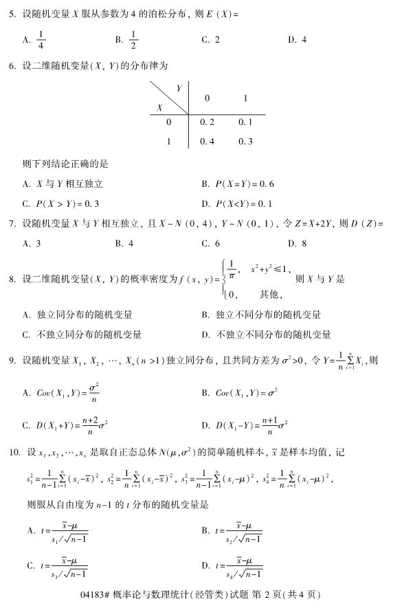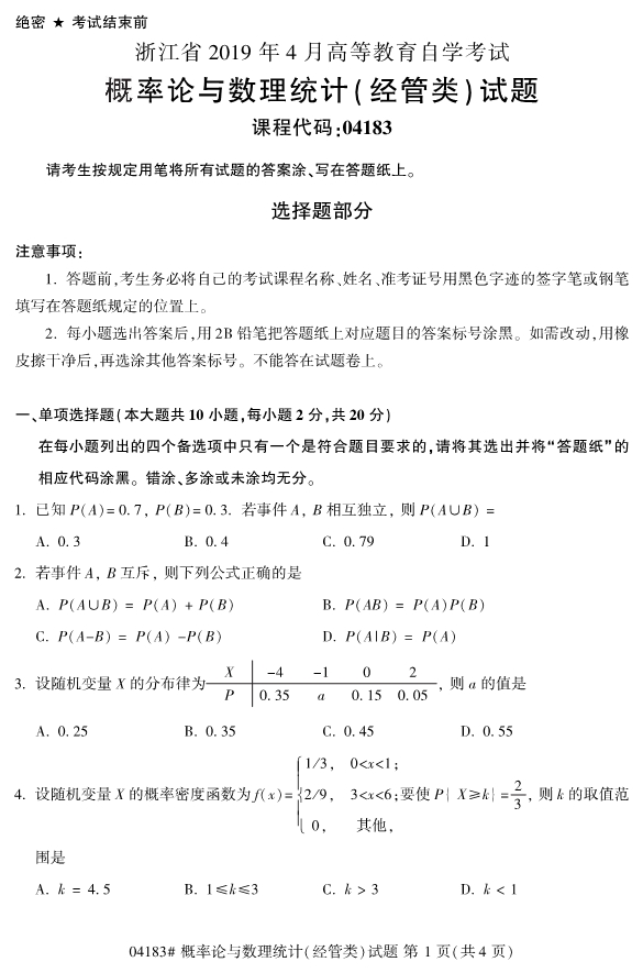 真题下载:全国2019年4月自考04183概率论与数理统计(经管类)真题