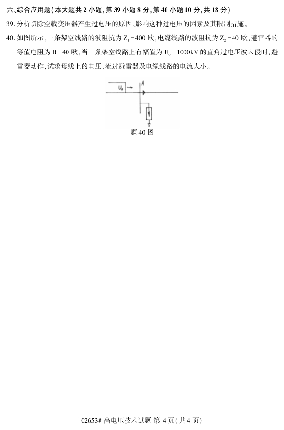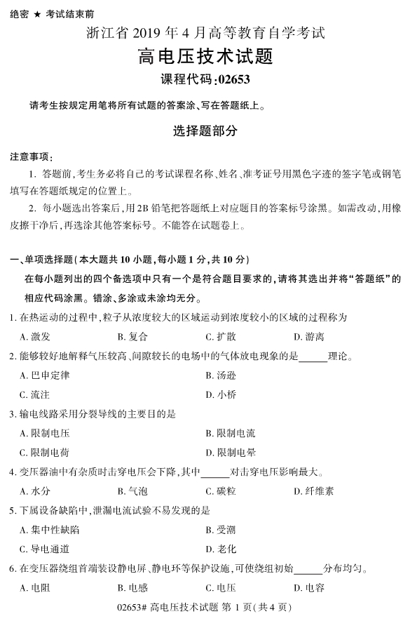 • 所在位置:浙江自考网 > 自考试卷 > 浙江省2019年4月自考02653高电压技术真题