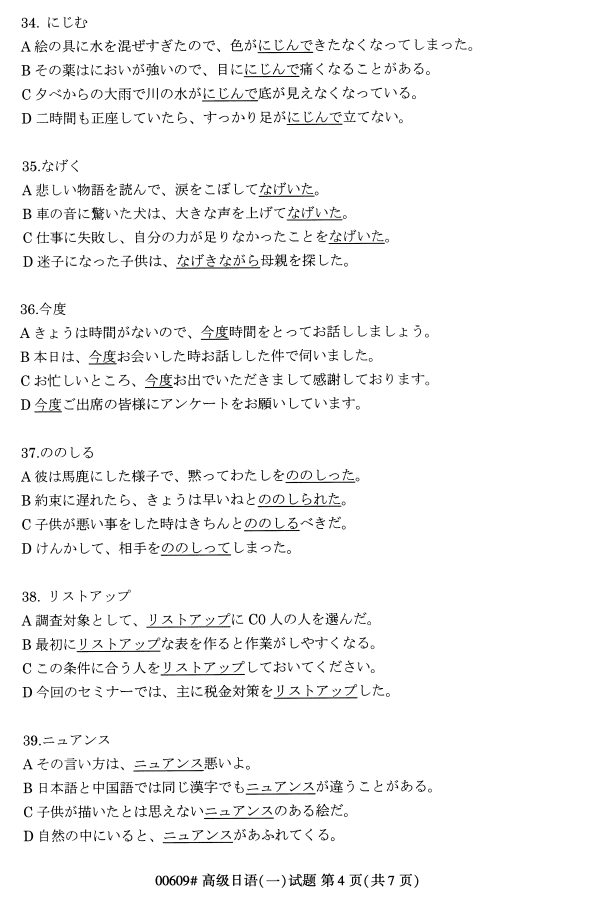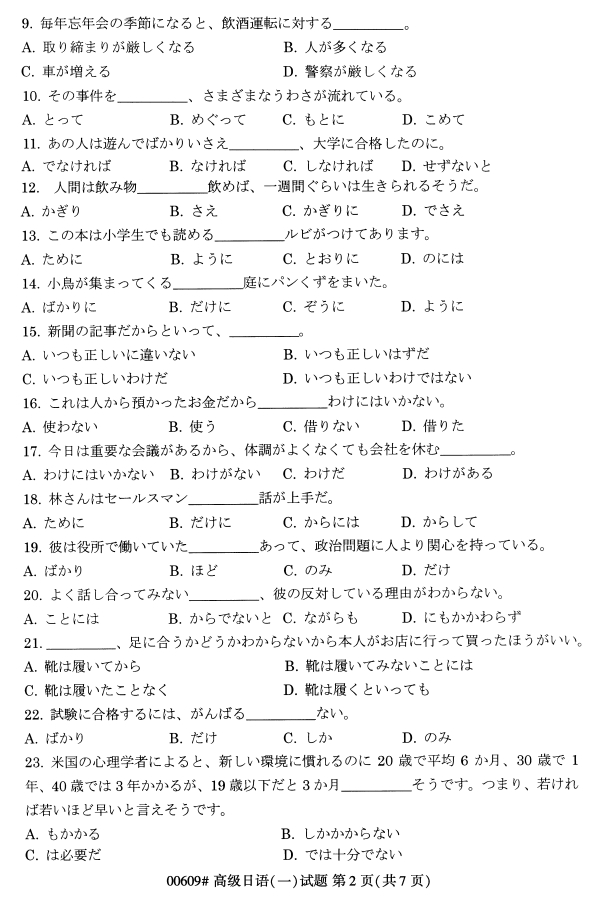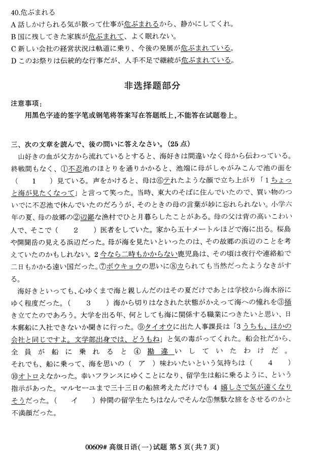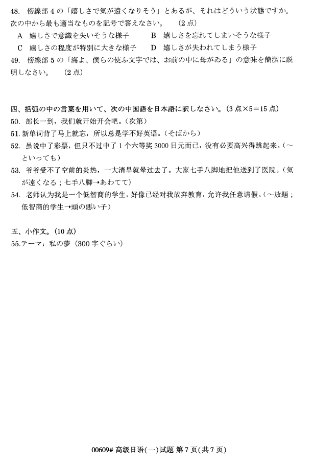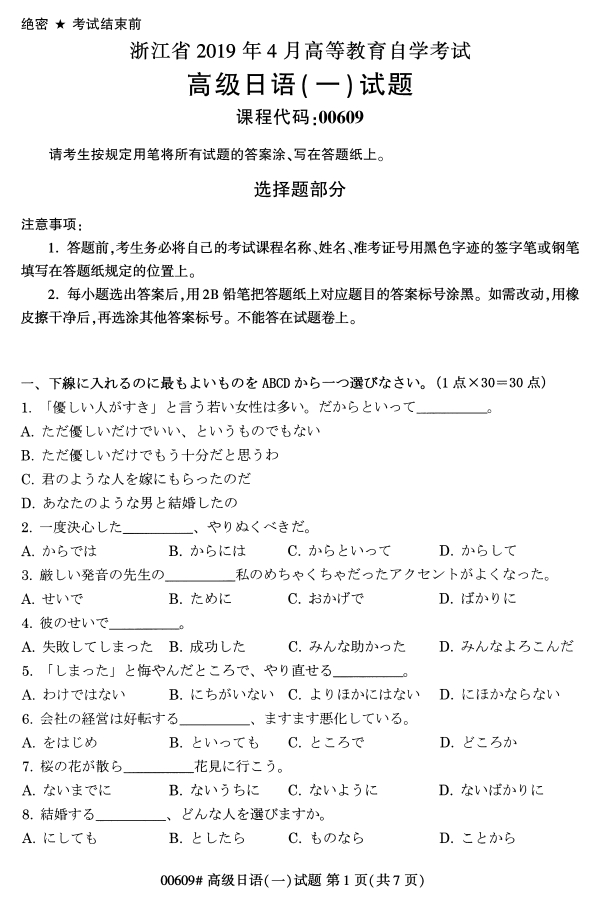 真题下载:浙江省2019年4月自考00609高级日语(一)真题