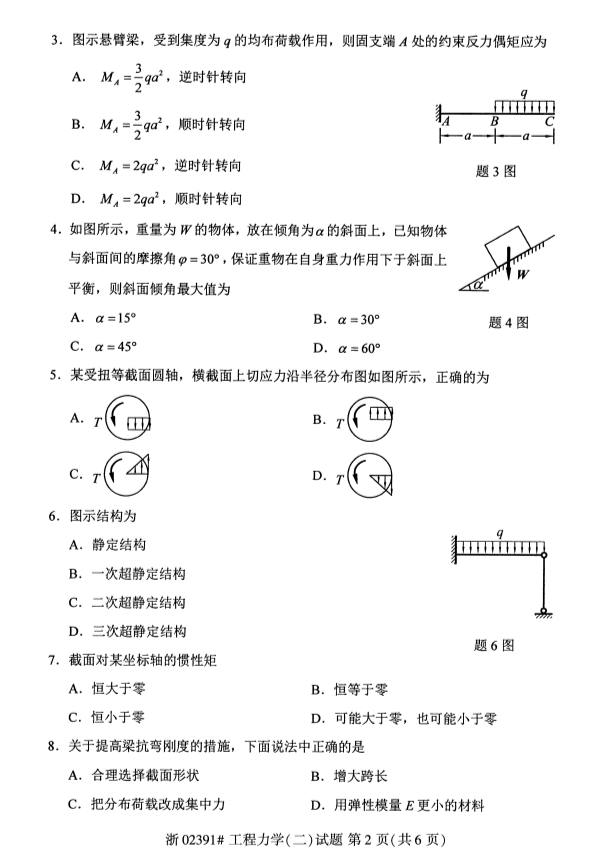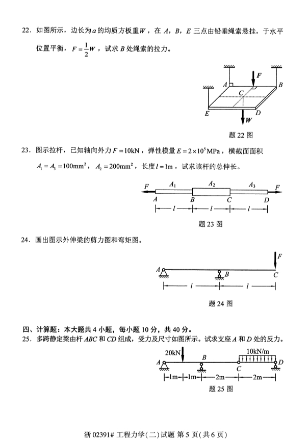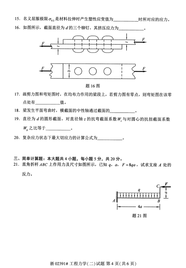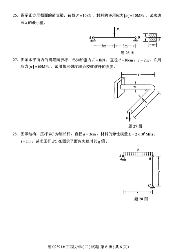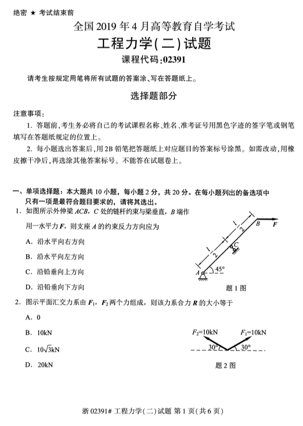 真题下载:全国2019年4月自考02391工程力学(二)真题