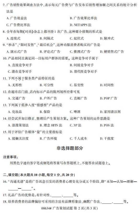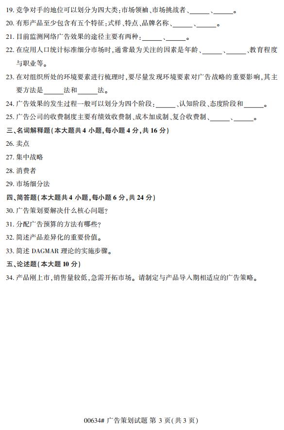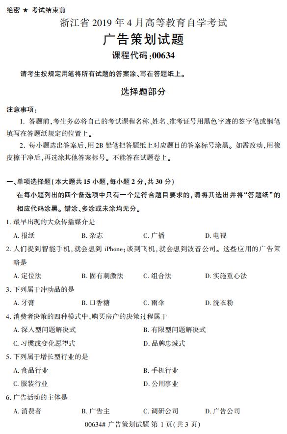 真题下载:浙江省2019年4月自考00634广告策划真题