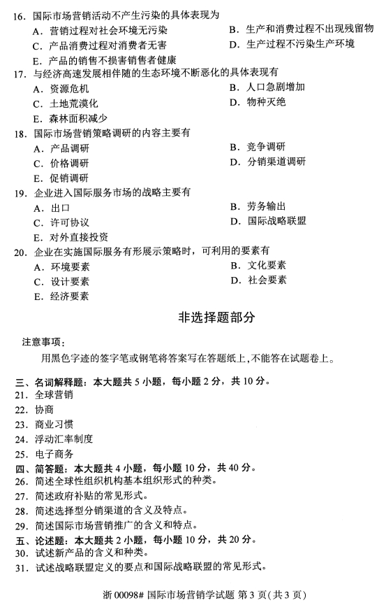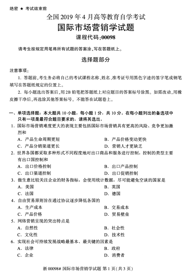 • 所在位置:浙江自考网 > 自考试卷 > 全国2019年4月自考00098国际市场营销学真题