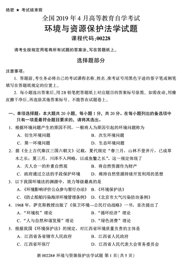 真题下载:全国2019年4月自考00228环境与资源保护法学真题