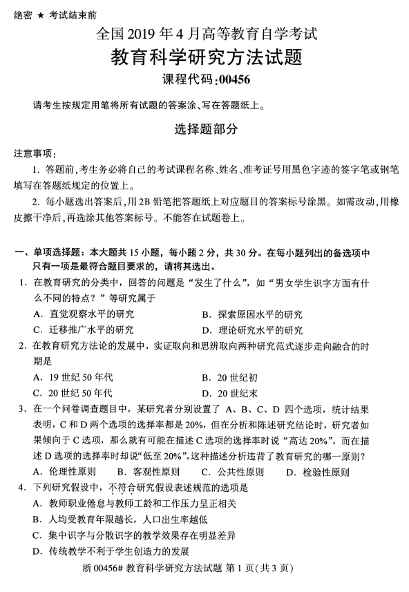真题下载:全国2019年4月自考00456教育科学研究方法真题