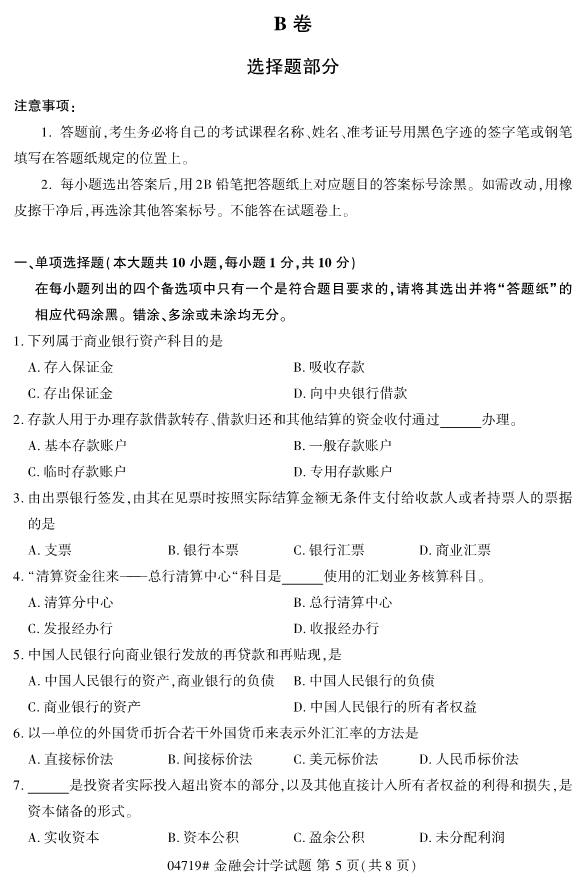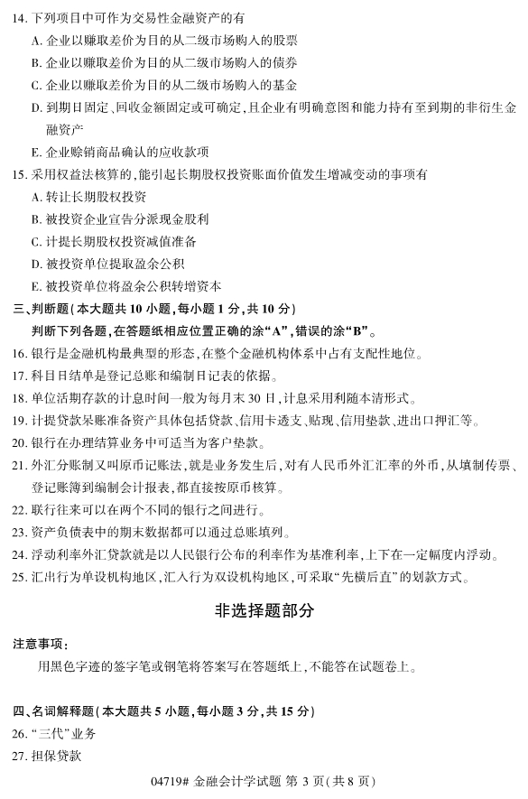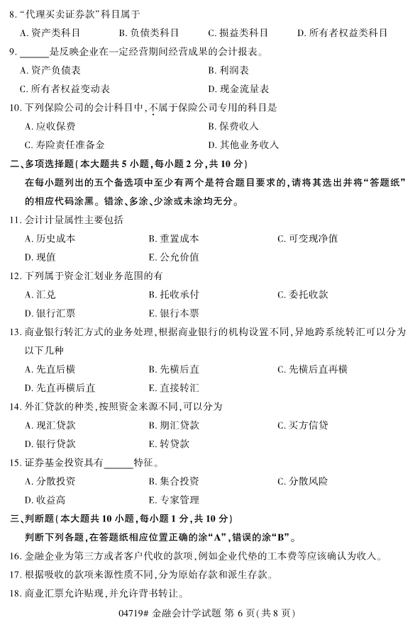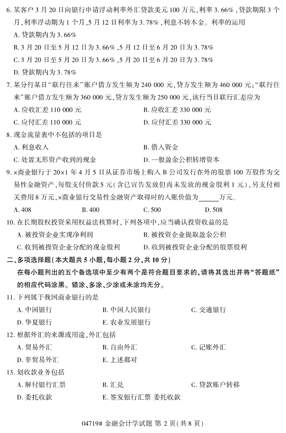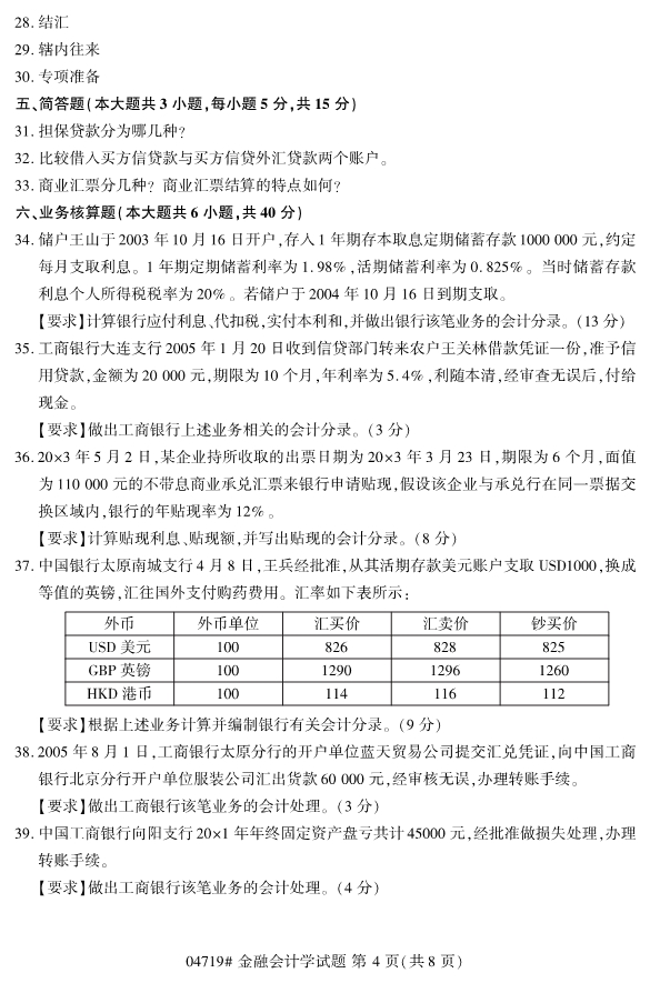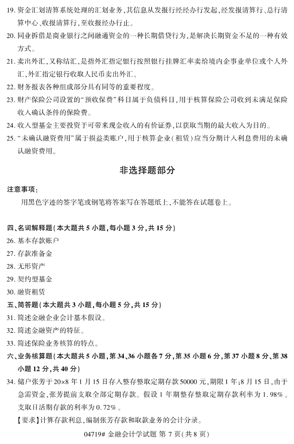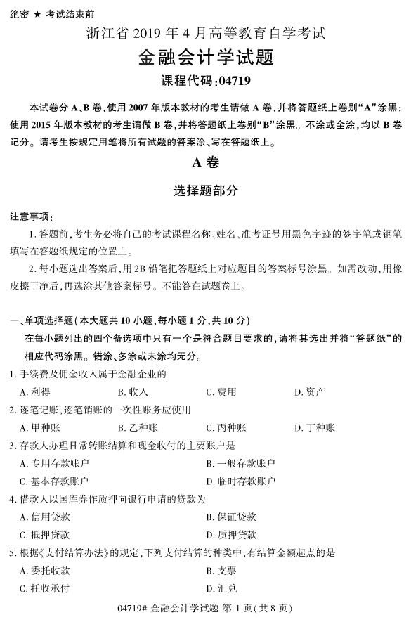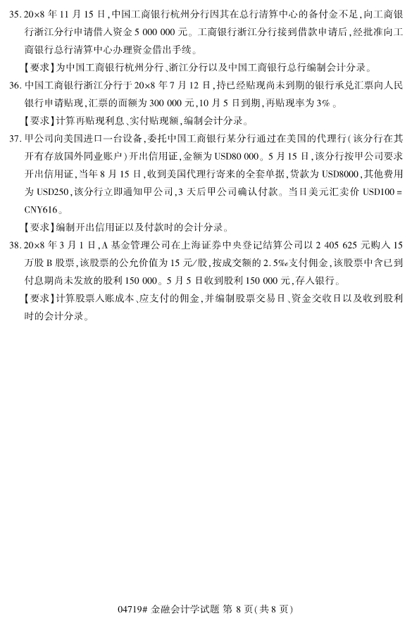 浙江省2019年4月自考04719金融会计学真题