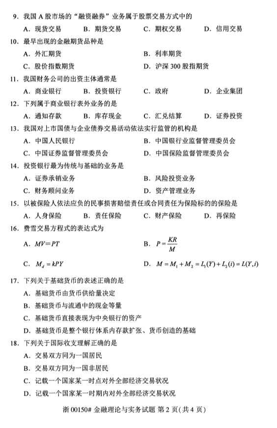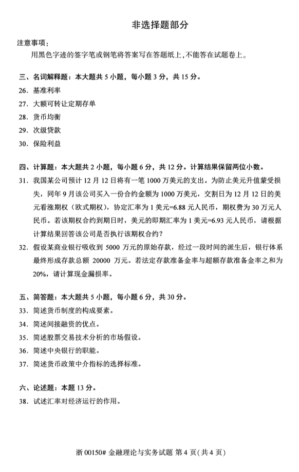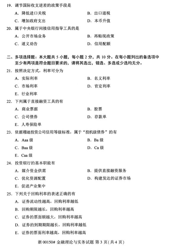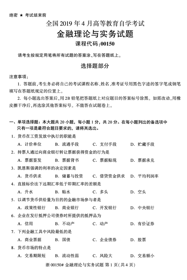 真题下载:全国2019年4月自考00150金融理论与实务真题