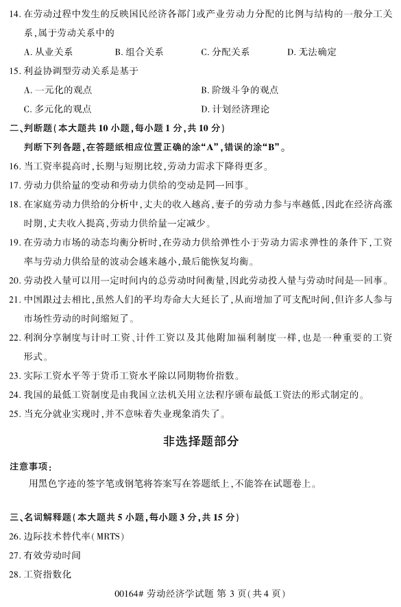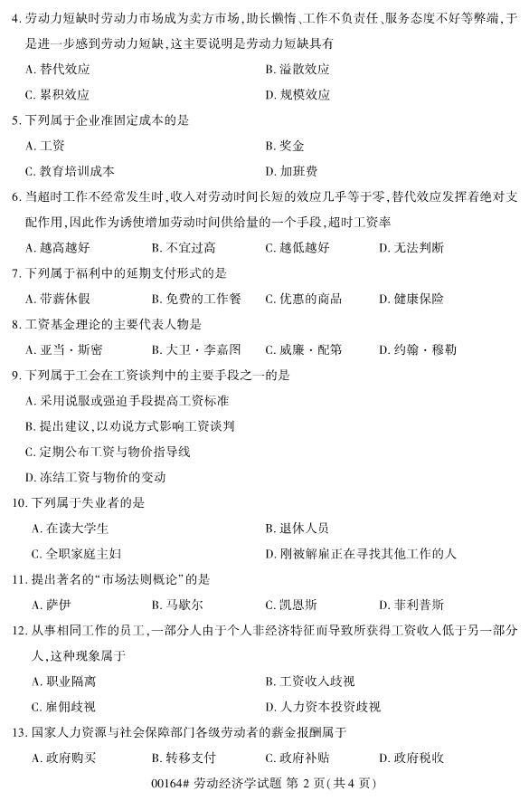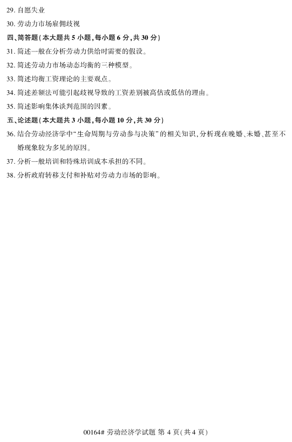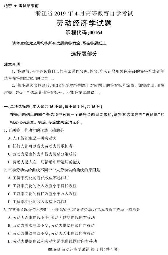 真题下载:浙江省2019年4月自考00164劳动经济学真题
