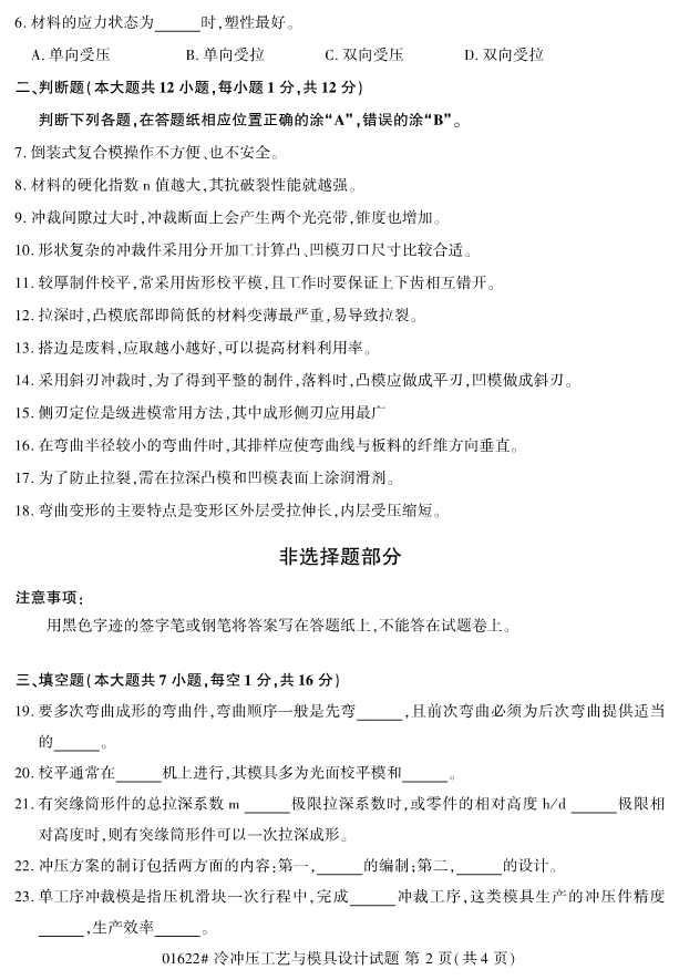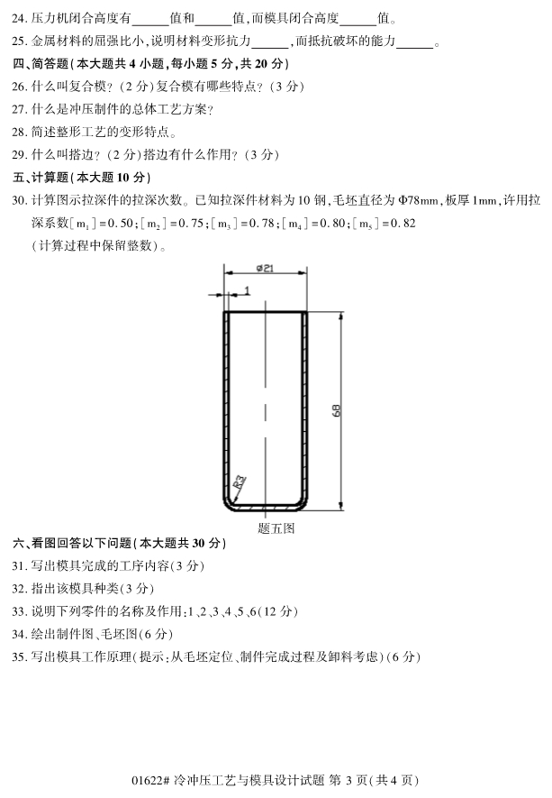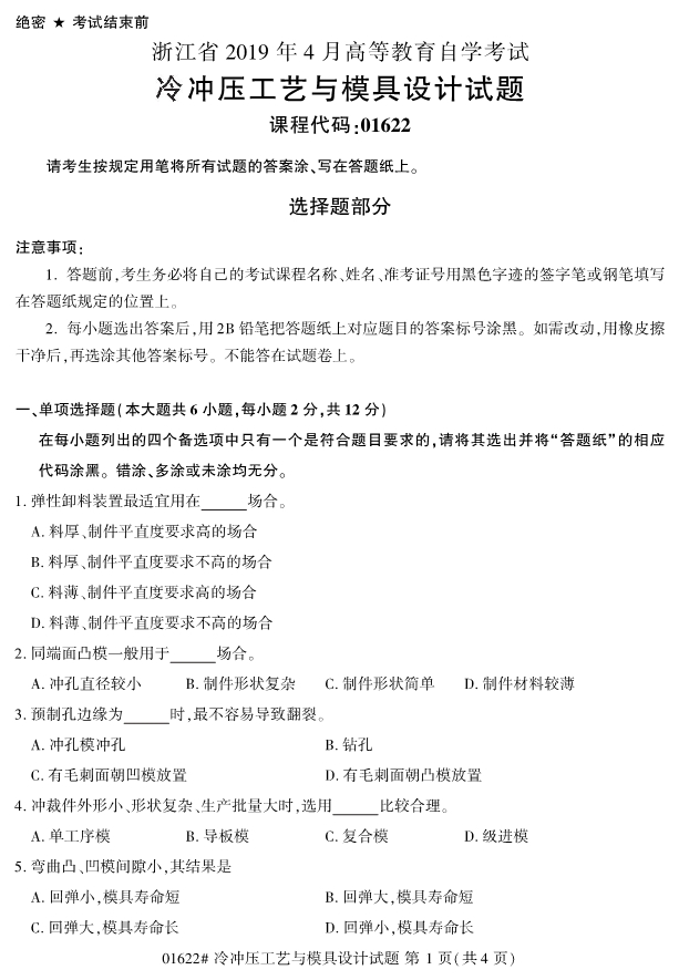 浙江省2019年4月自考01622冷冲压工艺与模具设计真题