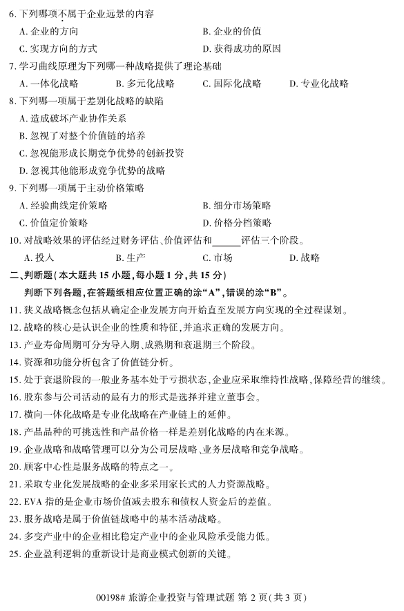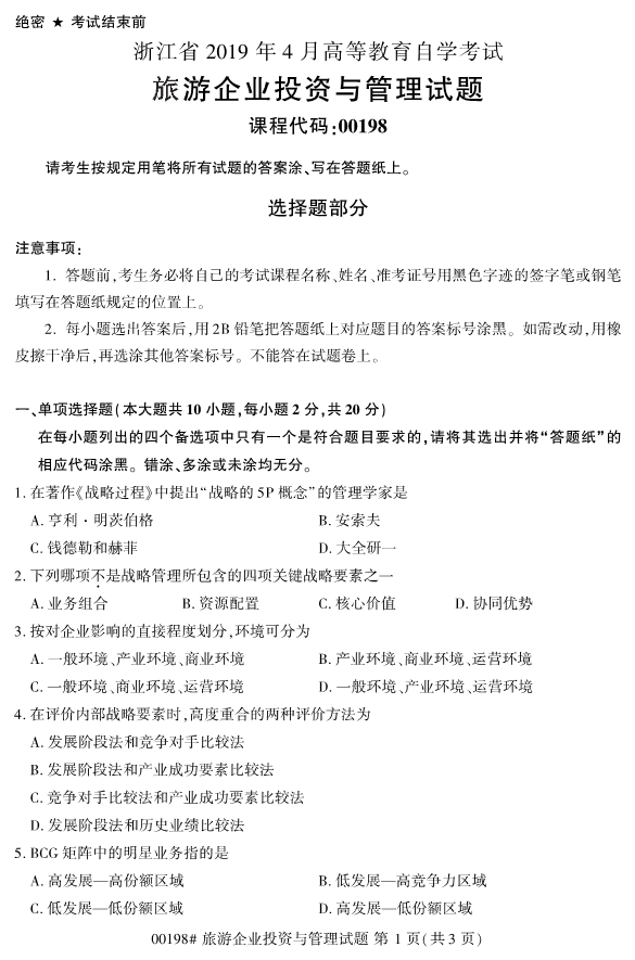 真题下载:浙江省2019年4月自考00198旅游企业投资与管理真题