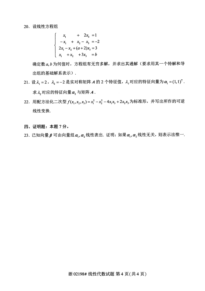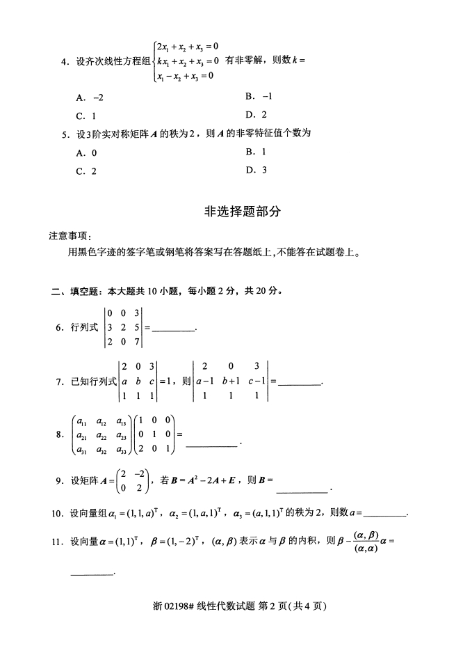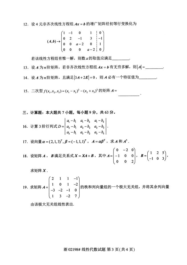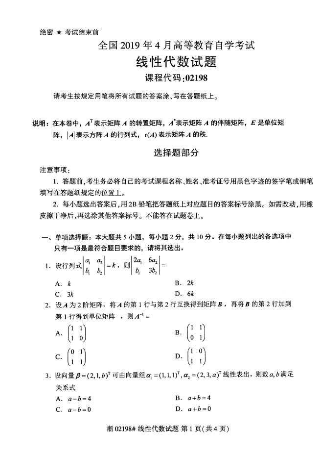 真题下载:全国2019年4月自考02198线性代数试题