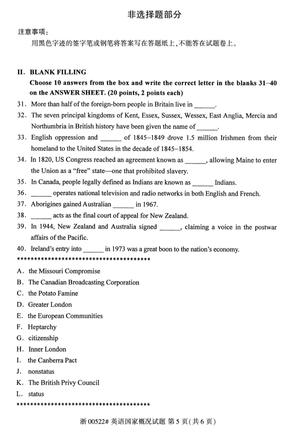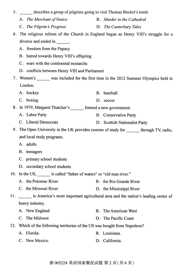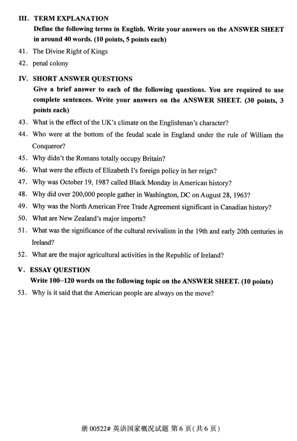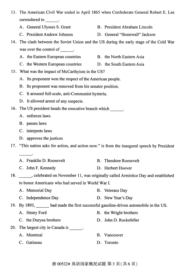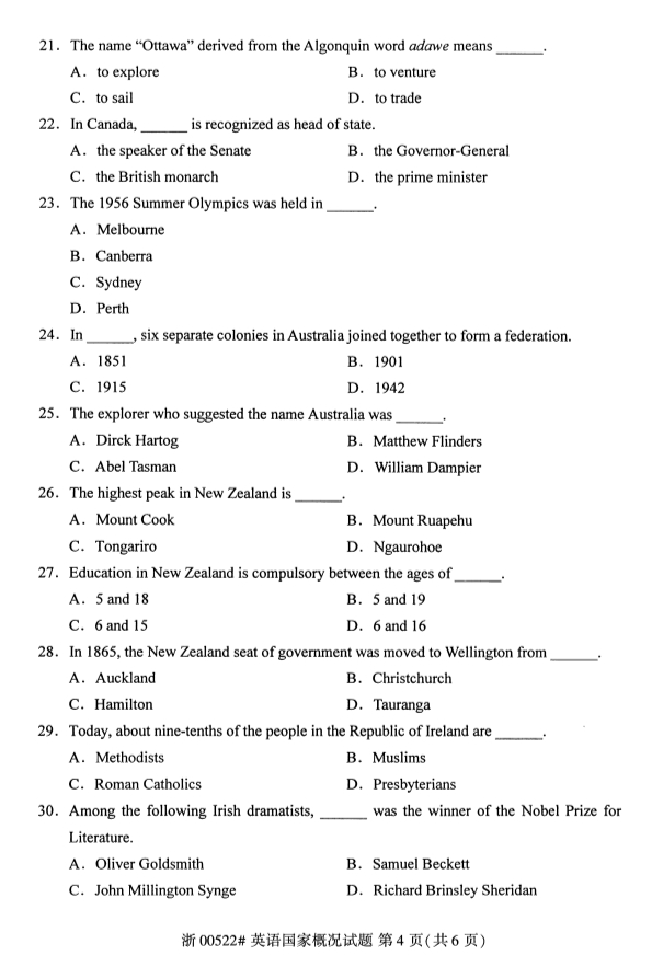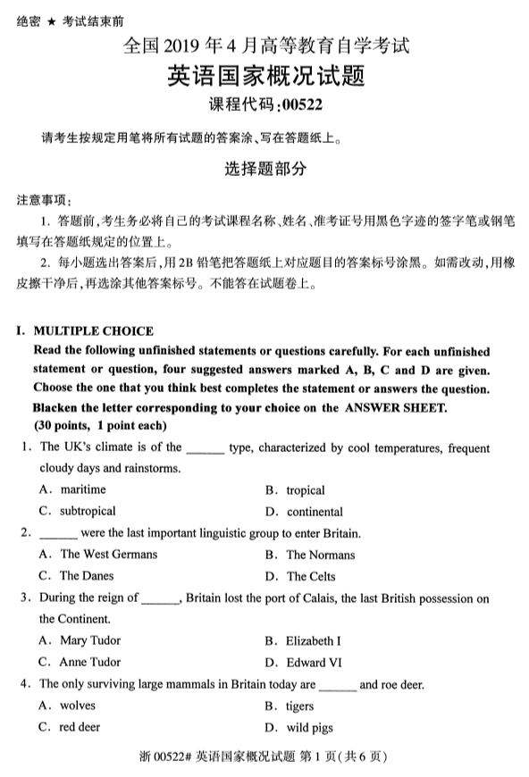 真题下载:浙江省2019年4月自考00522英语国家概况试题