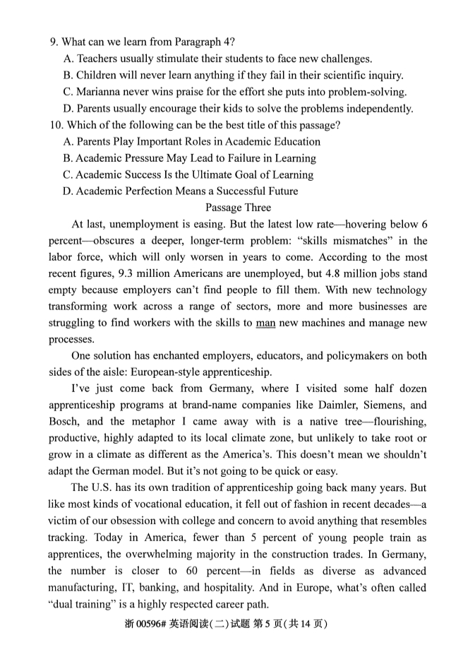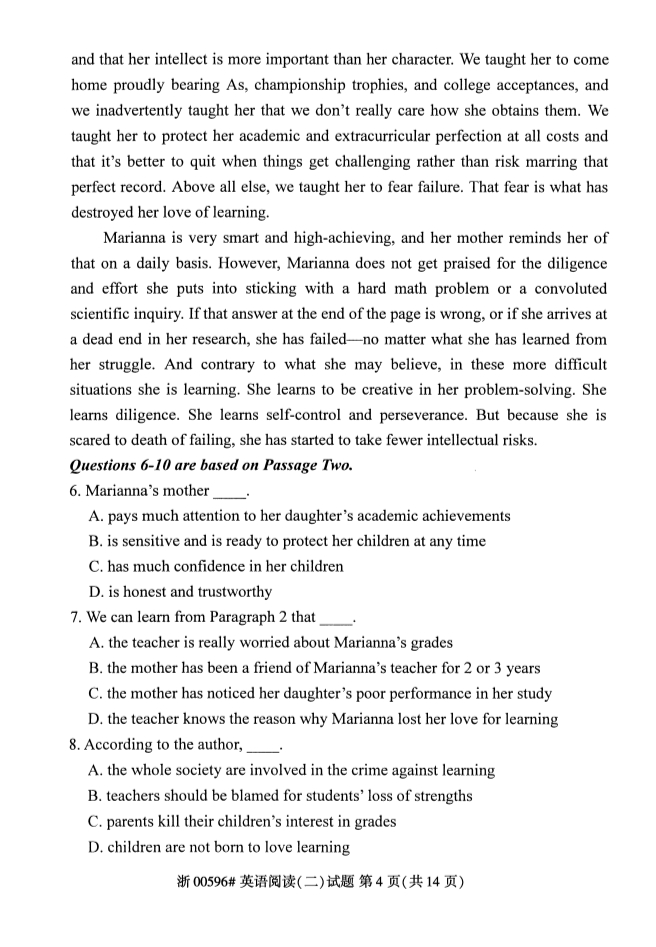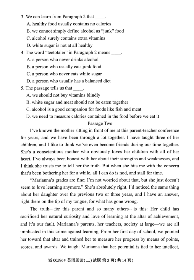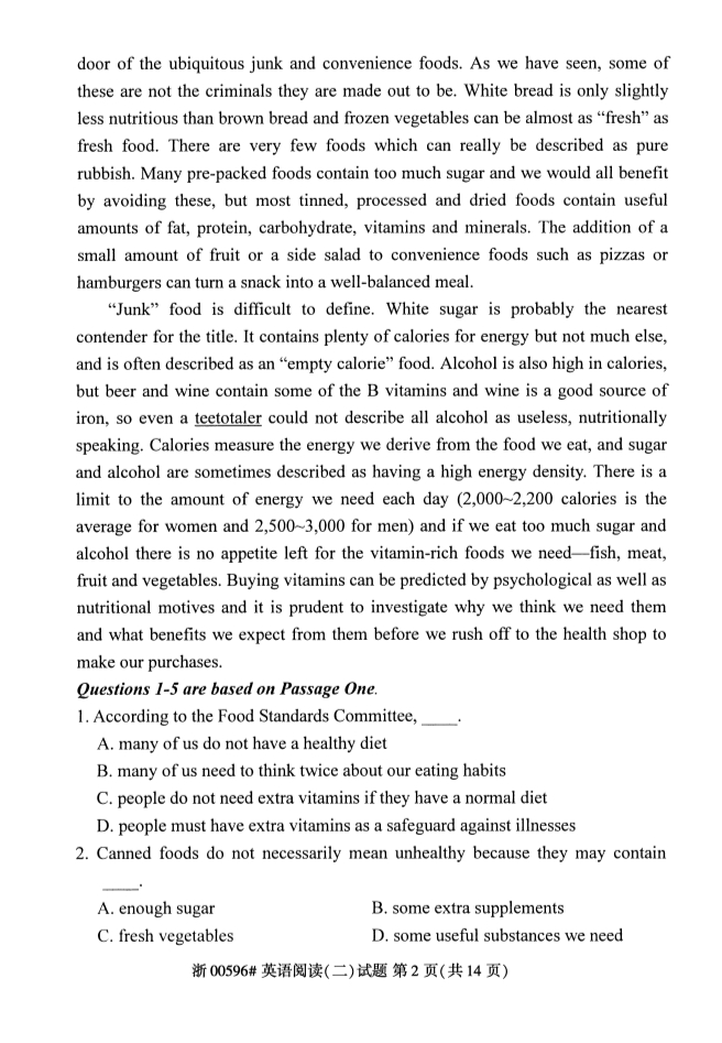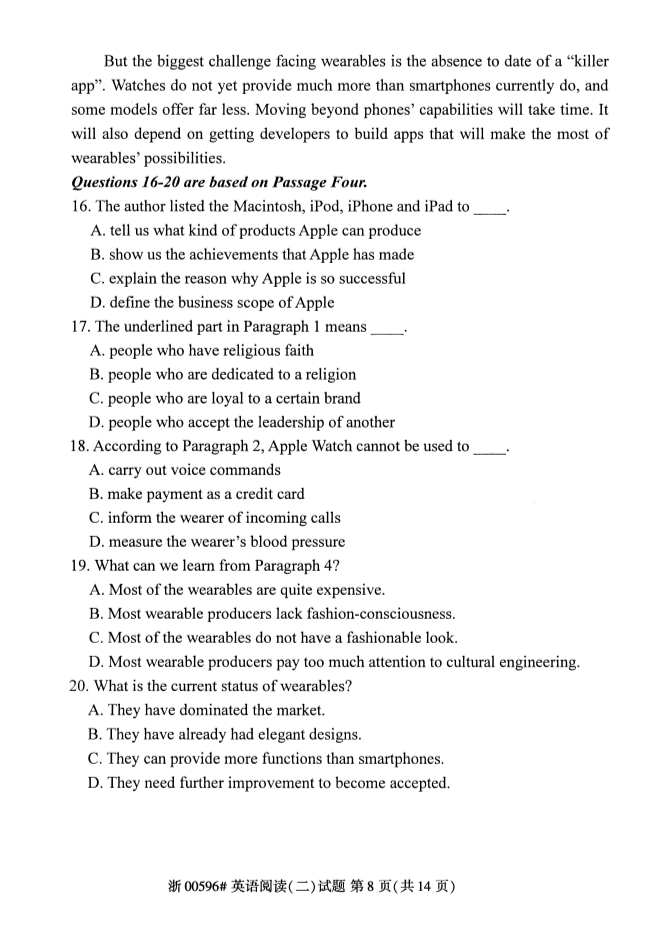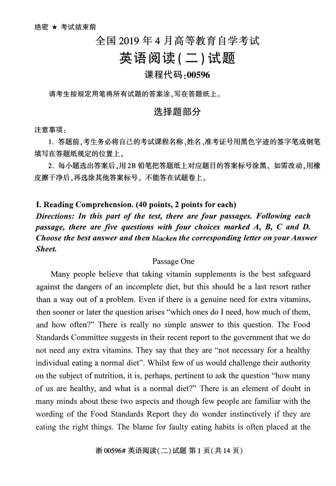 真题下载:浙江省2019年4月自考英语阅读(二)试题