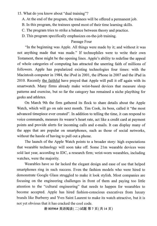 浙江省2019年4月自考00596英语阅读(二)试题